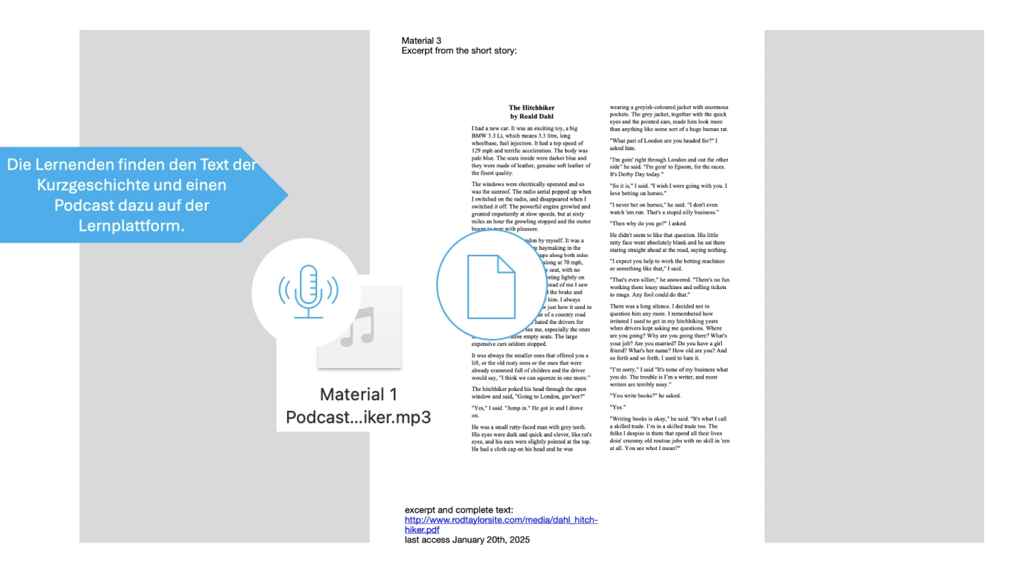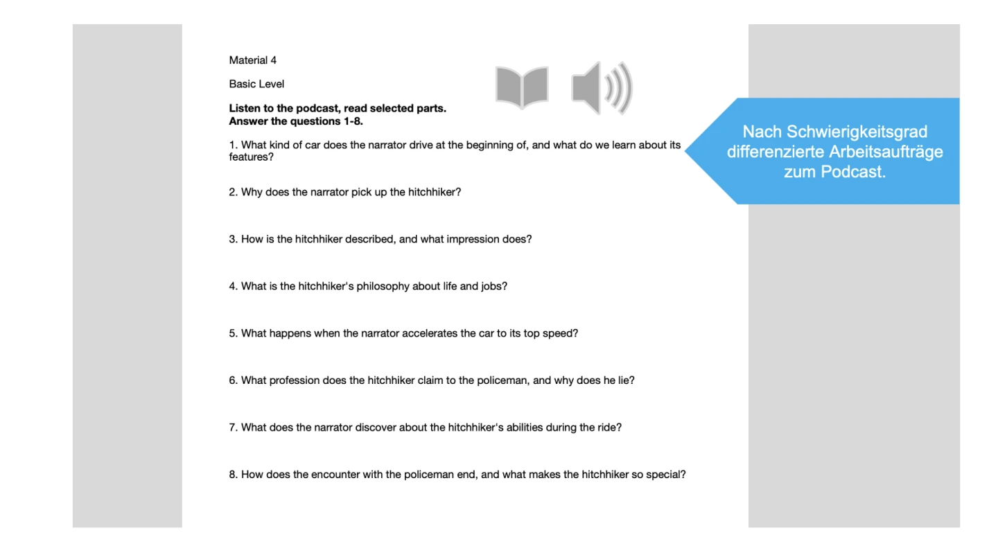 Lesen des Beginns der Kurzgeschichte (Material 3) in Einzelarbeit und Anhören eines Podcasts über die Kurzgeschichte mit Leitfragen (20 Minuten) - Material 4 (basic/expert) und Podcast.