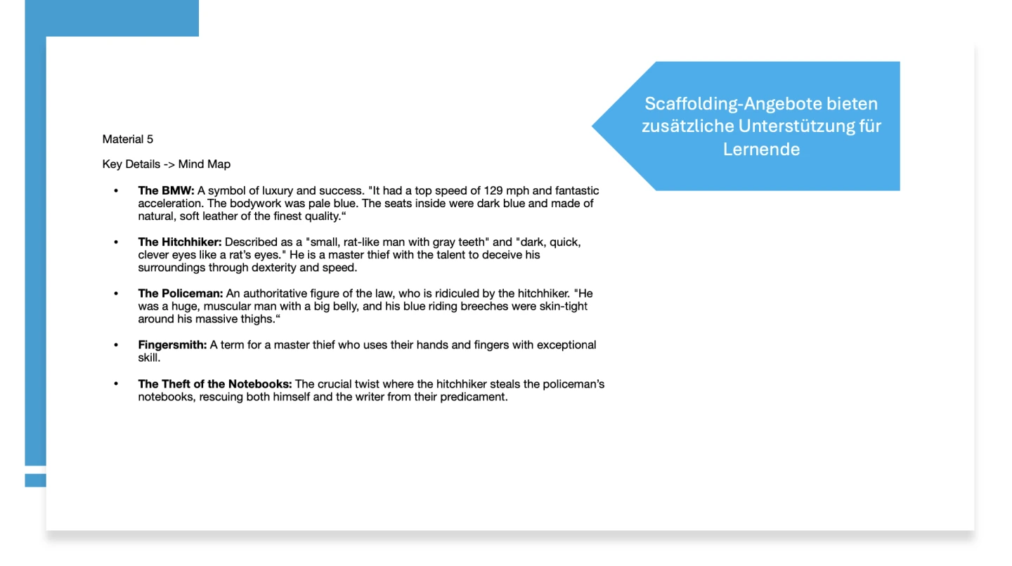 Das Thema der Stunde wird zunächst anhand der Kurzgeschichte „The Hitchhiker“ von Roald Dahl gewählt, die einen interessanten Einblick in die Bedeutung von Literatur und die Entwicklung einer Gesellschaft bietet und somit das Interesse der Schüler/-innen wecken kann. Die aktive Einbeziehung der Schüler/-innen in die Diskussion zu Beginn der Unterrichtseinheit (Guessing, elements storytelling) ermöglicht es ihnen, ihre eigenen Erfahrungen und Perspektiven einzubringen.