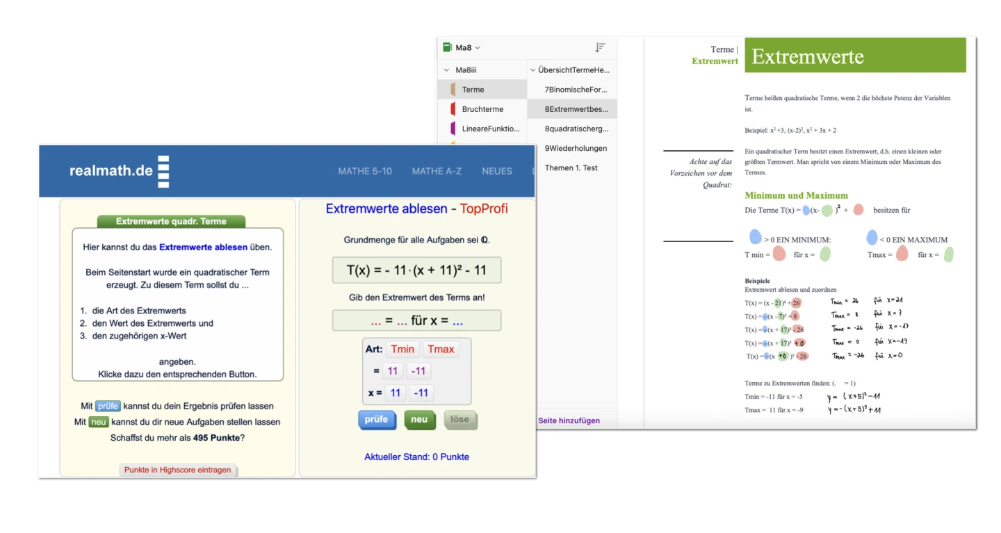 Der Lerninhalt wird zunächst gemeinsam im Unterricht erarbeitet und im Heft sorgfältig festgehalten. Im Anschluss daran üben die Lernenden eigenständig und im individuellen Tempo mithilfe von Online-Übungen, um das Verständnis zu vertiefen und den Lernstoff zu festigen.