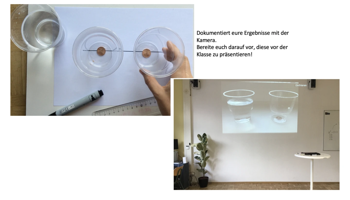 Der Ablauf des Experiments wird mithilfe einer Kamera digital dokumentiert. Die entstandenen Bilder und Aufnahmen werden der gesamten Klasse zugänglich gemacht, sodass die Beobachtungen gemeinsam ausgewertet und diskutiert werden können. Dadurch wird ein reflektierter Austausch gefördert und das Verständnis vertieft.