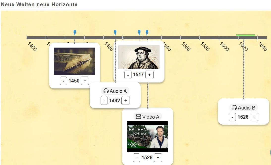 Die komplexen historischen Entwicklungen von 1450 bis 1648 können mithilfe einer Zeitleiste den Lernenden anschaulich und multimedial zur Verfügung gestellt werden. Durch Verlinkungen erhalten die Lernenden außerdem noch weitere Informationen zu den Themengebieten. -