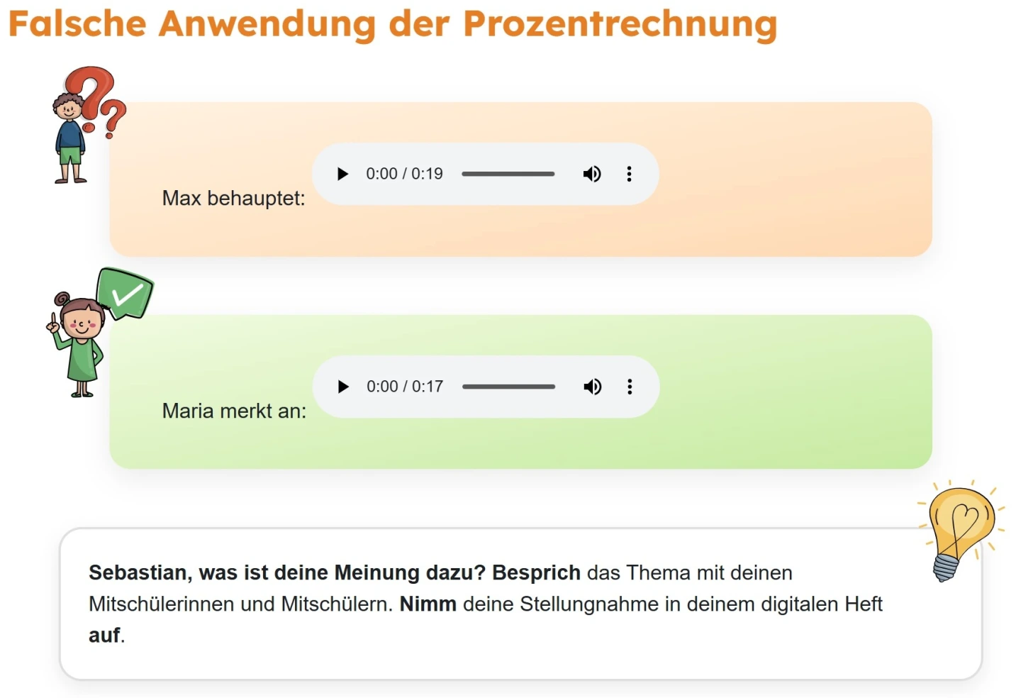 In der mebis Lernplattform wird über eine Audiodatei ein häufiger Fehler bei der Prozentrechnung aufgeworfen. Dieser Unterrichtsimpuls sorgt für Abwechslung und Motivation bei den Lernenden. -