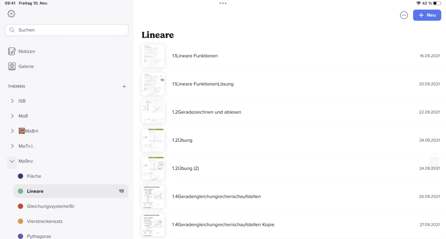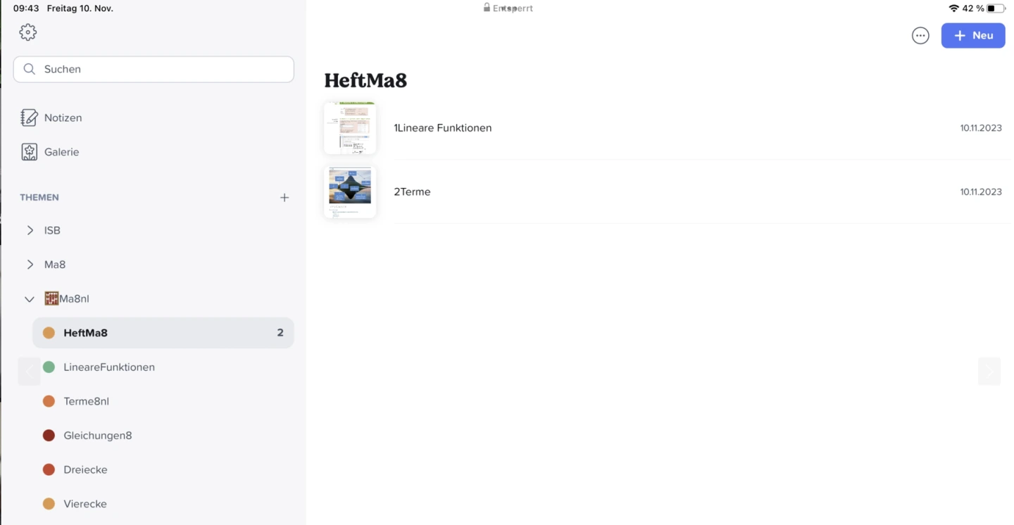 Uns ist eine klare Gliederung wichtig, damit die Lernenden sowie deren Eltern die Übersicht behalten. Merk- und Übungsheft sind bei uns analog und der frühere Schnellhefter wird durch eine Notizen-App ersetzt. Somit sparen wir viele Ausdrucke und können flexibel das nutzen, was im Unterricht gebraucht wird.