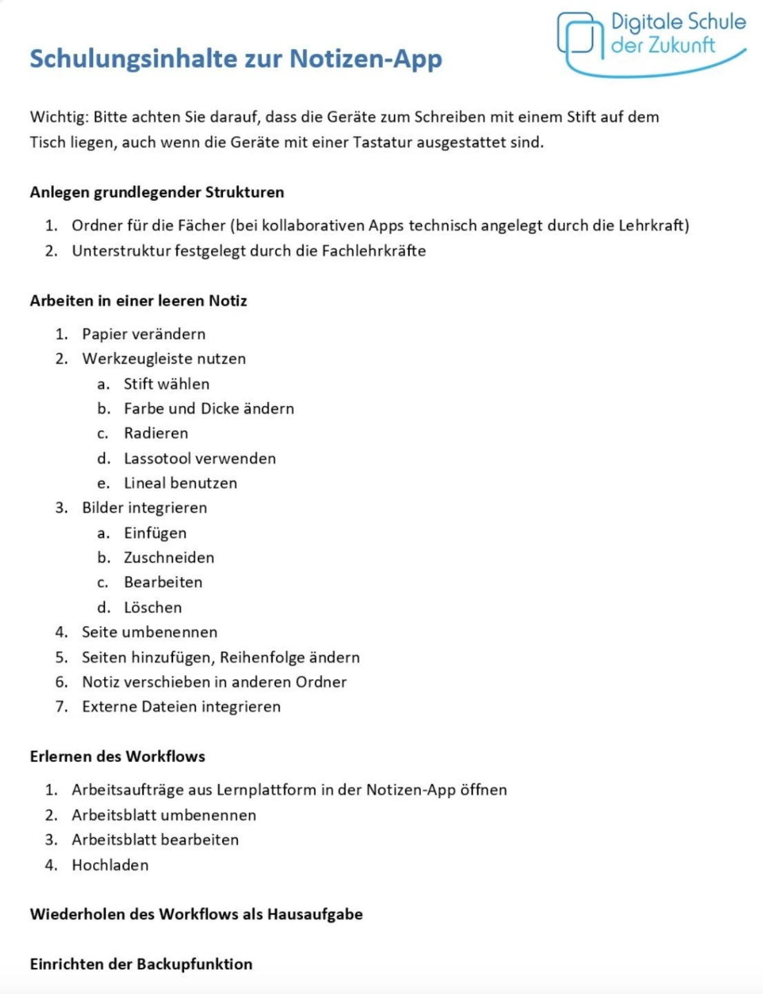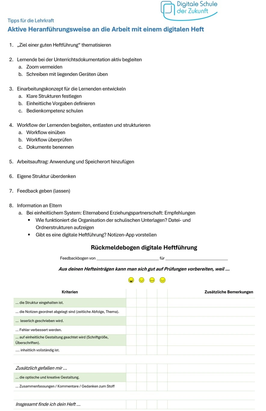 Um die Vorgaben hinsichtlich der Struktur und Nutzung digitaler Hefte zu vermitteln, empfiehlt sich ein Schulungskonzept für die Lernenden.