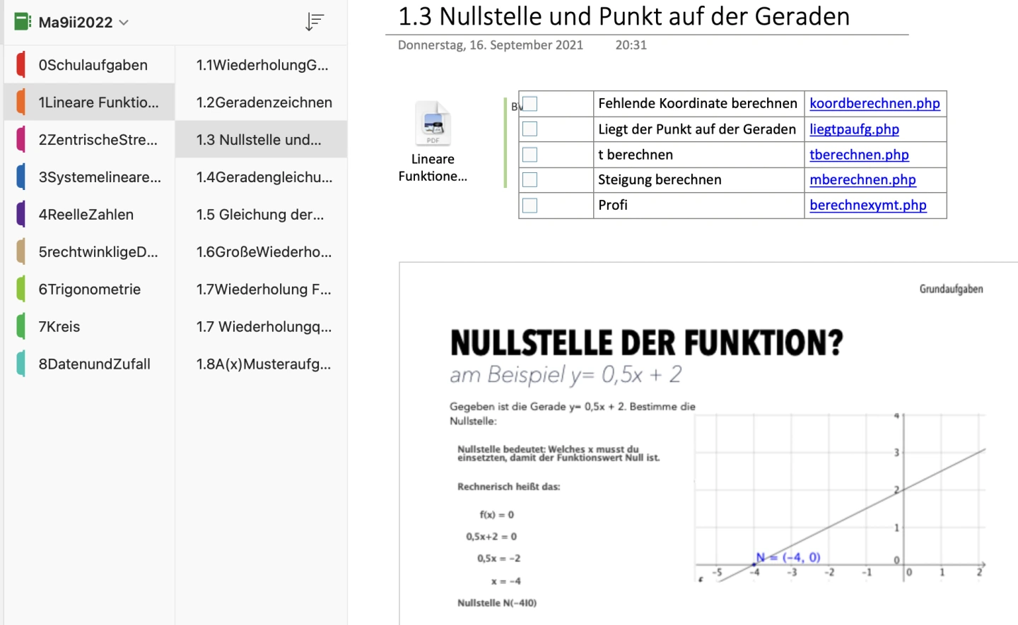 Daher bietet es sich an, für Hefteinträge einen eigenen Bereich zu erstellen und Übungen sowie Übungsblätter in einem anderen Ordner des Lehrplaninhaltes zu sammeln. Dazu kann man sich überlegen, ob die Hefteinträge als einzelne Notiz abgelegt werden, wie hier dargestellt.