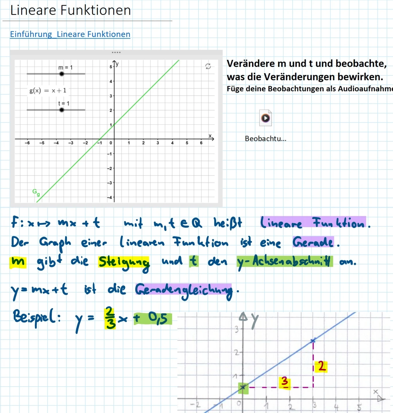 Beobachtungsaufträge zu interaktiven Ansichten lassen sich im digitalen Heft stellen. Mit Audioaufnahmen können die Lernenden ihre Beobachtungen direkt neben der Ansicht sichern. Vielfältige, leicht anpassbare Markierungen unterstützen die Übersicht und das Verständnis von Zusammenhängen. Geraden lassen sich analog mit Stift und Papier zeichnen, im digitalen Heft einfügen und weiter bearbeiten. Formeln können weiterhin unkompliziert handschriftlich notiert werden, ohne einen Formeleditor zu nutzen.