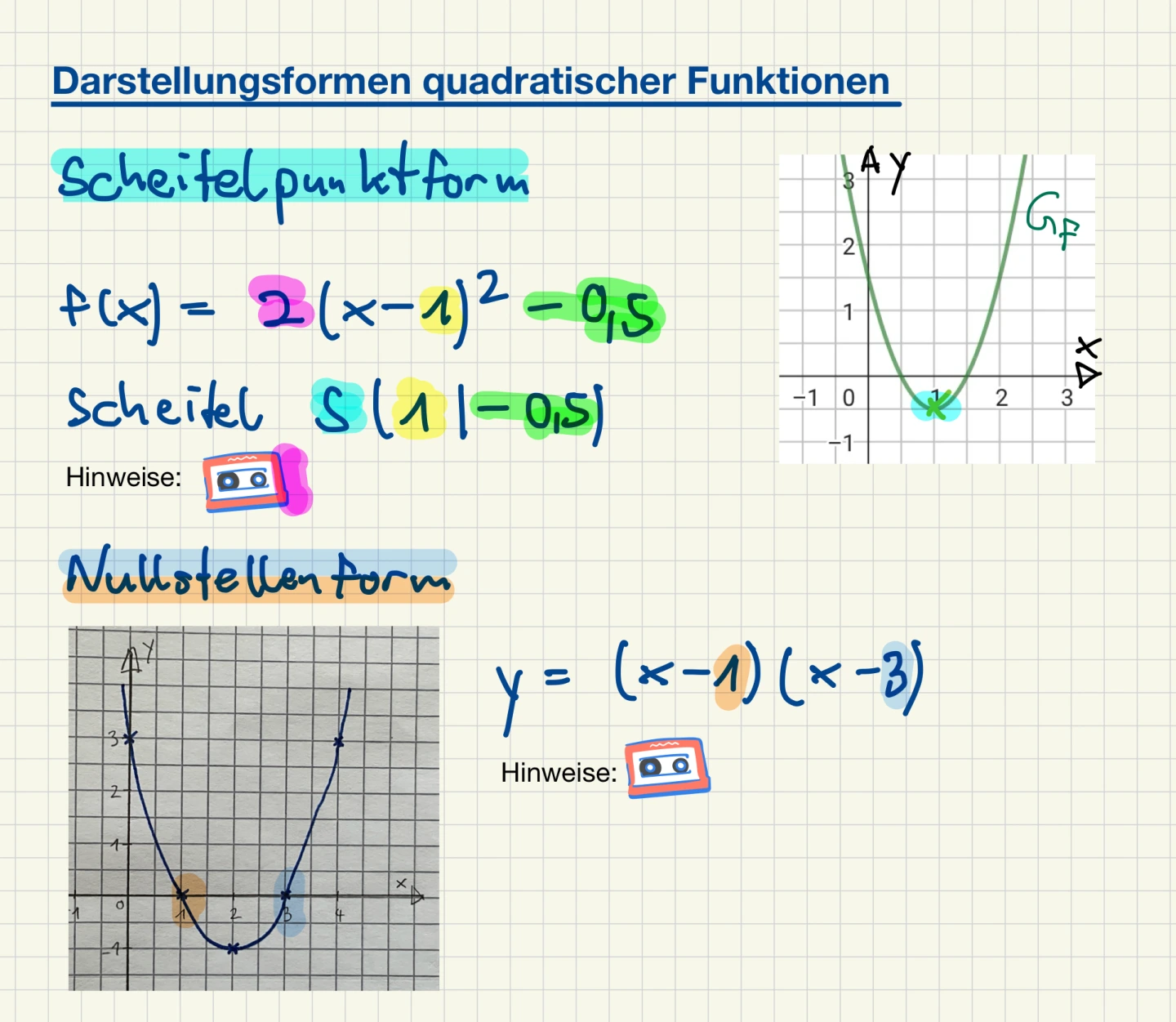 Digitale Arbeitsergebnisse (z. B. mit einem Funktionsplotter erstellte Graphen) lassen sich über Screenshots im digitalen Heft einfügen und weiter bearbeiten. Markierungen und ergänzende Audioaufnahmen unterstützen die Veranschaulichung und das Verständnis. Auch analoge Arbeitsergebnisse können über Fotos schnell eingefügt und ergänzend bearbeitet werden.