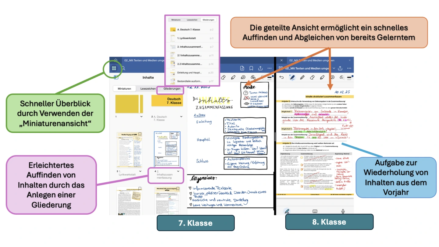 Werden über mehrere Schuljahre hinweg digitale Hefte geführt, stehen deren Inhalte zu jeder Zeit gesammelt zur Verfügung. So können unkompliziert Hefteinträge aus verschiedenen Schuljahren aufgerufen werden, was ein schnelles Anknüpfen an Wissen aus den Vorjahren ermöglicht. Im Deutschunterricht wiederholen sich beispielsweise Textsortenmerkmale oder bestimmte Aufsatzformen, die über die Jahre hinweg eine Vertiefung erfahren. In höheren Jahrgangsstufen können Lehrkräfte nun sehr einfach auf bereits Gelerntes verweisen und darauf aufbauen.