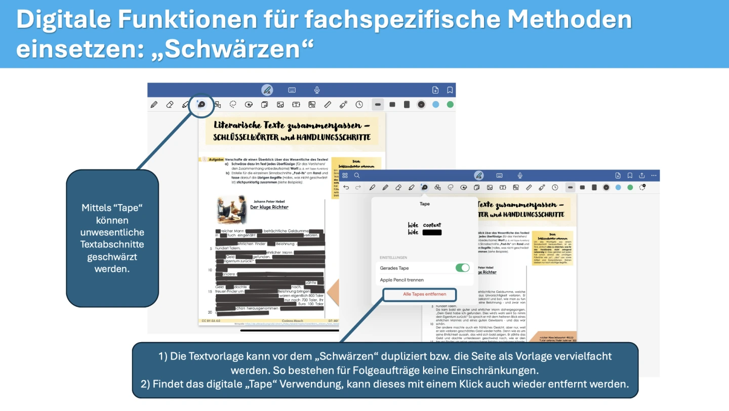 Digitale Hefte bieten Funktionen, die Methoden der Texterschließung vereinfachen und bereichern können. So lassen sich Textpassagen schwärzen, ohne dass die Textvorlage verloren ginge. Der Fokus wird auf das Wesentliche des Textes gelenkt.