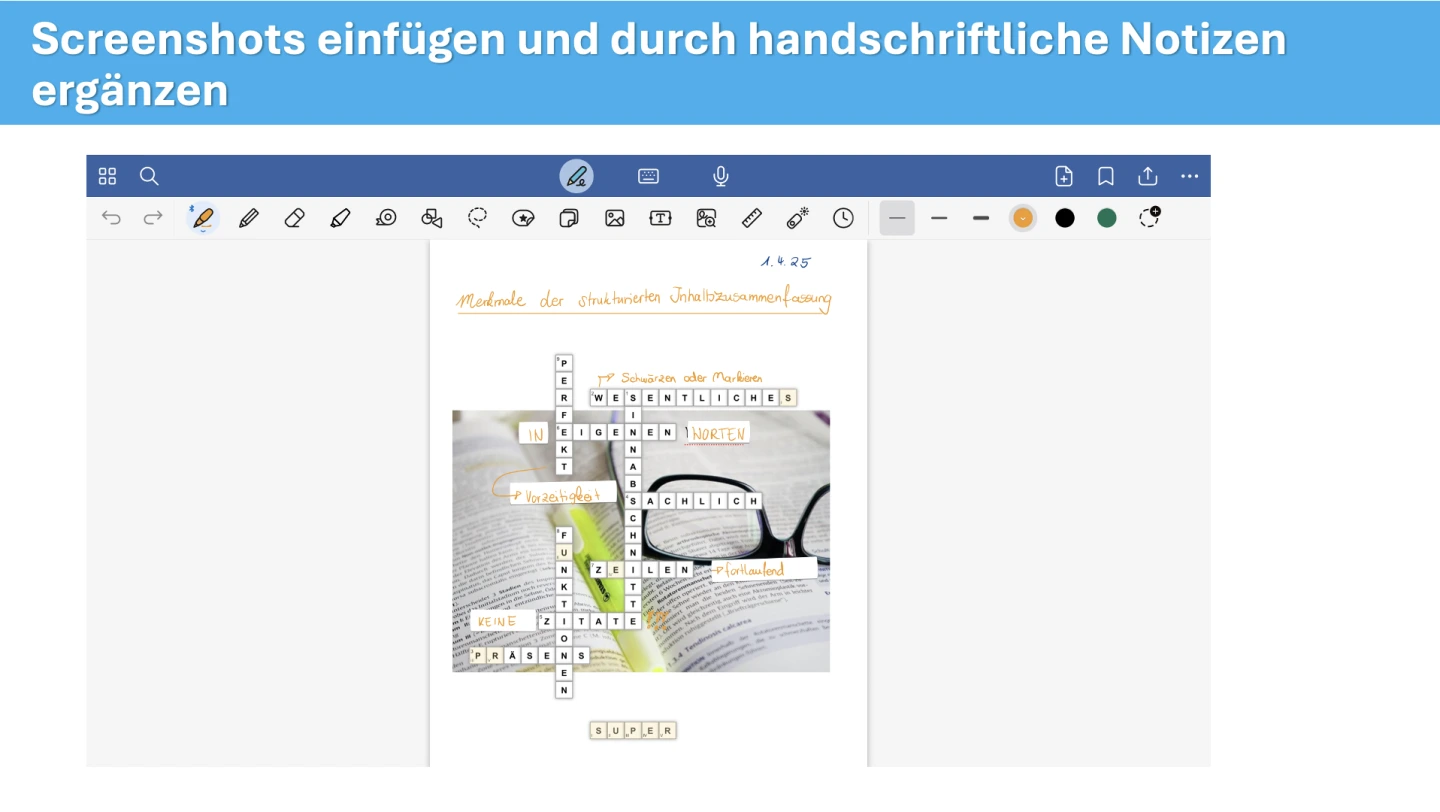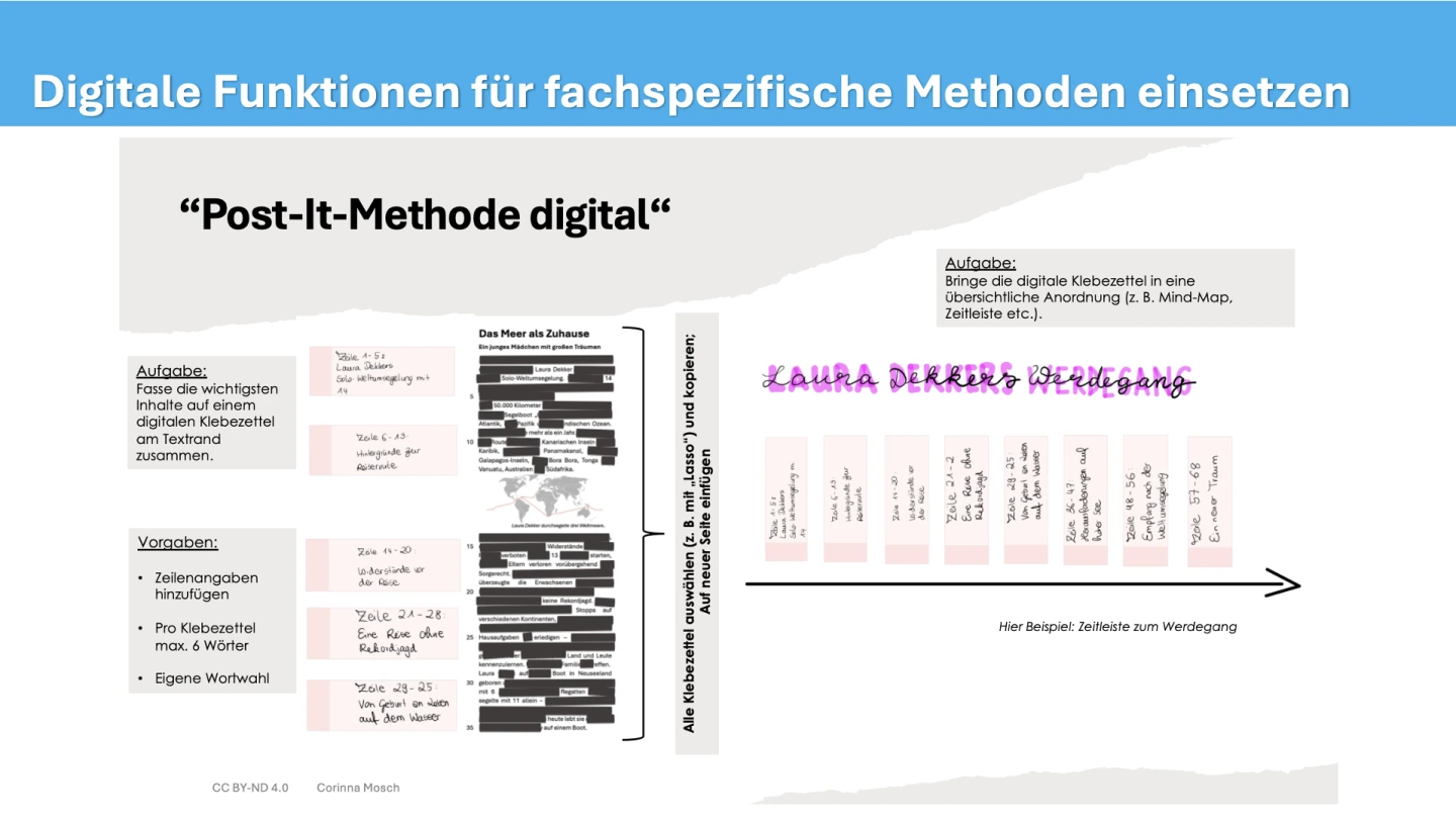 Digitale Hefte bieten Funktionen, die Methoden der Texterschließung vereinfachen und bereichern können. Das Wesentliche wird auf digitalen Klebezettel festgehalten, die wiederum auf einer neuen Heftseite und ohne Schwund neu angeordnet und erweitert werden können.