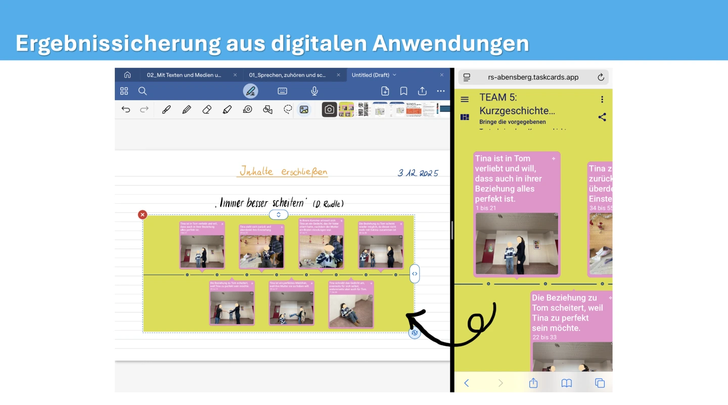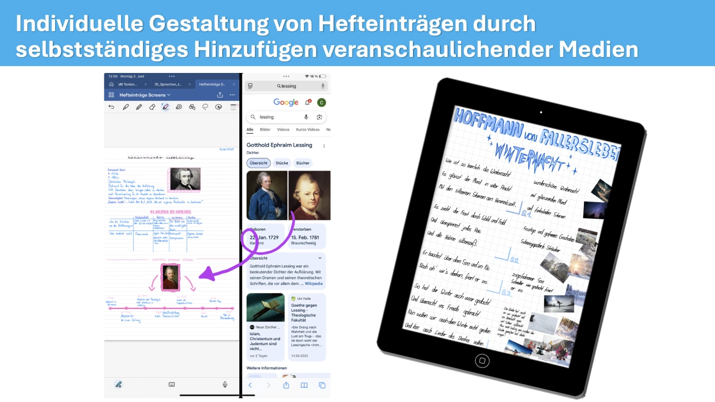 “Im digitalen Heft kann ich Unterrichtsinhalte sehr anschaulich darstellen (lassen). Meine Schülerinnen und Schüler können Bilder, Fotos und Screenshots (Urheberrecht beachten!) in ihre Hefteinträge einbinden. Im Sprachunterricht sind das häufig Abbildungen aus dem Schulbuch oder Internet sowie persönliche Fotos.”
