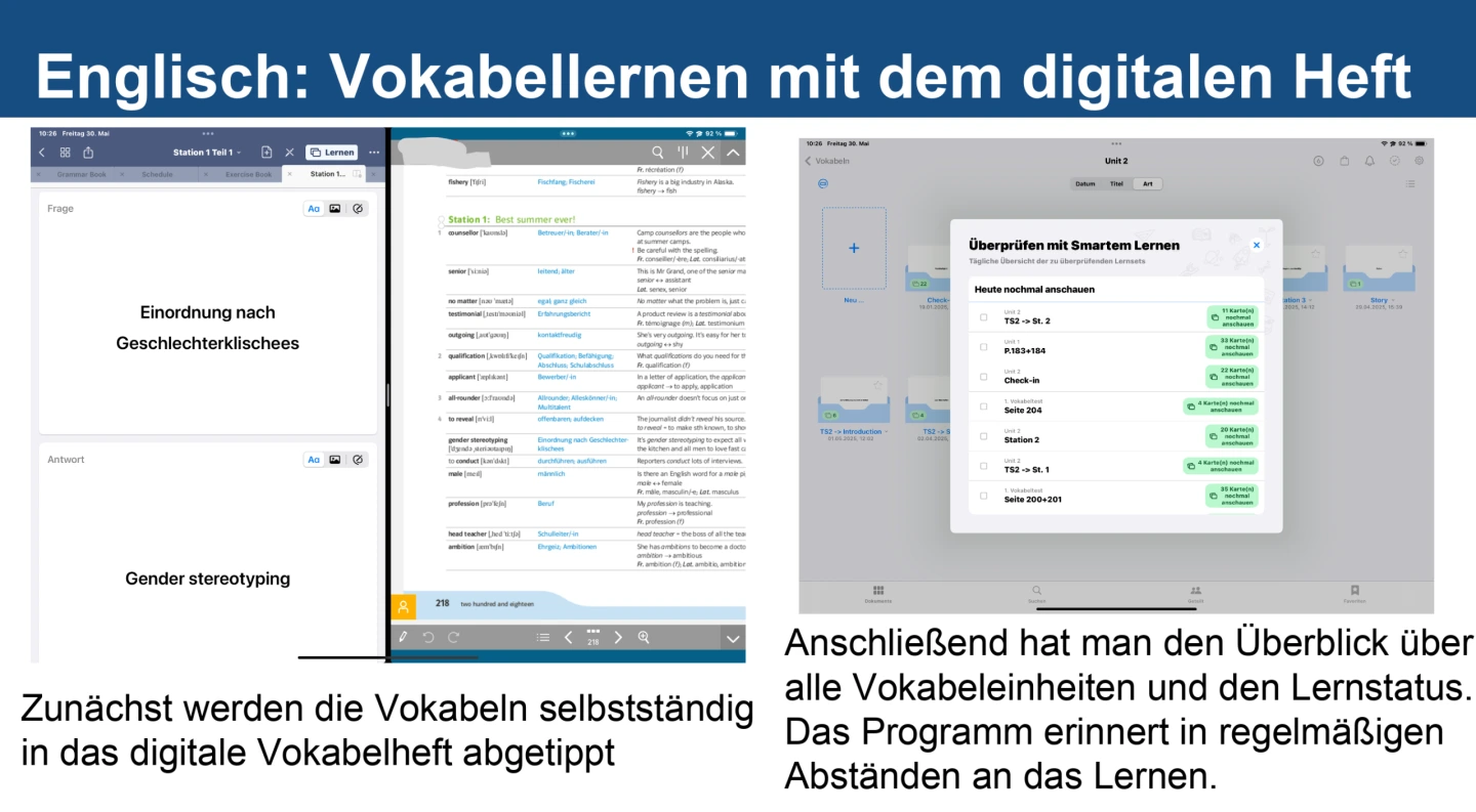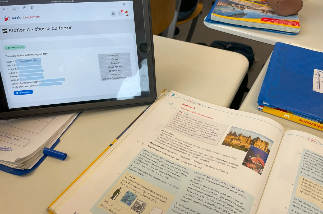 Analoges Buch mit dem Text und digitale Übungen dazu: Beides ist groß, man behält den Überblick.
