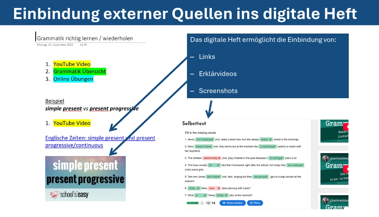 Das digitale Heft bietet gegenüber dem analogen Heft den Vorteil, dass sich externe Quellen über Links und Screenshots sehr unkompliziert einbinden lassen. Screenshots von gemachten Onlineübungen mit den markierten Fehlern und Links zu entsprechenden Erklärvideos erleichtern beispielsweise das Verständnis von Grammatik- oder Rechtschreibthemen.