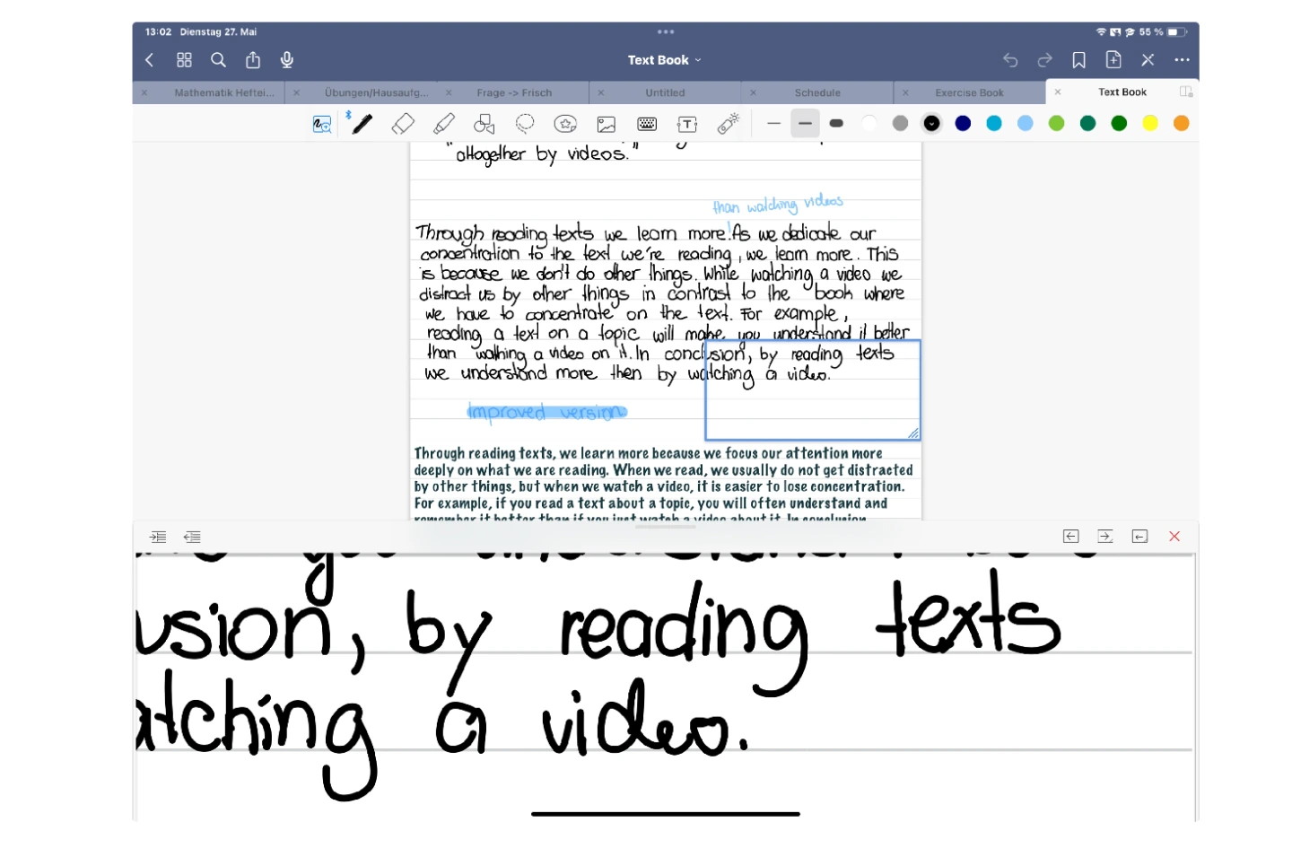 “Sobald es jedoch darum geht, eigene Gedanken zu entwickeln und strukturiert in einem längeren Text wiederzugeben schreiben wir auf häufig Papier. Die Verwendung eines digitalen Hefts bedeutet also nicht, dass alles nur noch digital ist. Nicht zuletzt deswegen, weil man durch das ständige Zoomen in die Zeilen schnell den Überblick verliert. ”
