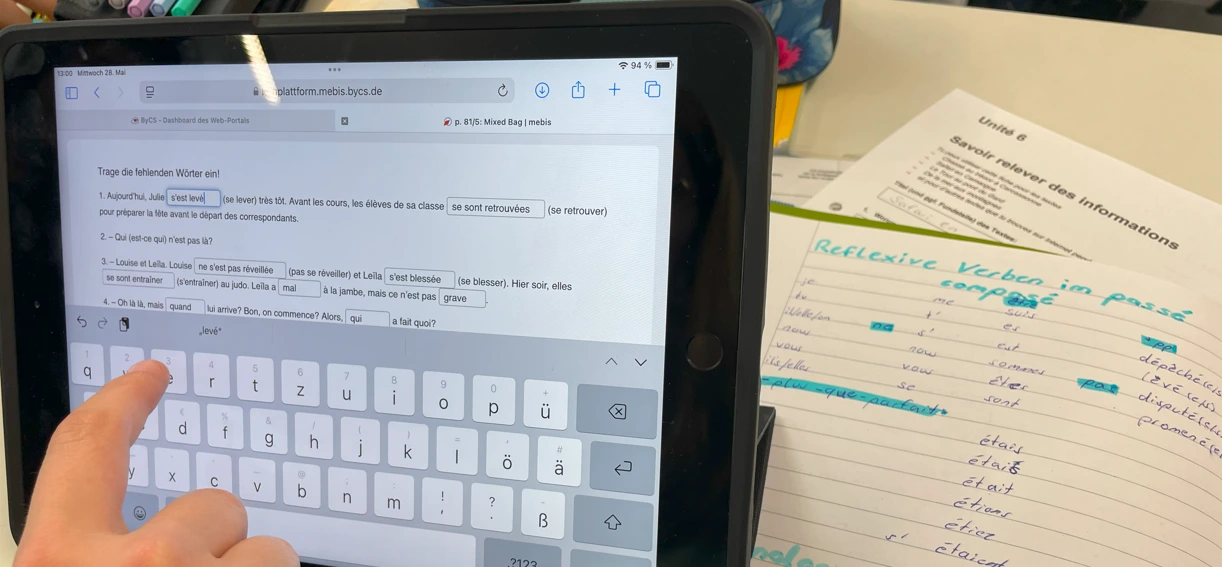 “Ich kombiniere in meinem Sprachunterricht oft analoges und digitales Arbeiten. Denn die Möglichkeit des ‘geteilten Bildschirms’ erweist sich nicht immer als vorteilhaft. Dies zeigt sich beispielsweise bei der aufgabengeleiteten Arbeit mit einem Video. Hier brauchen die Schüler eigentlich die gesamte Fläche des Tablets, um das Video sinnvoll bearbeiten zu können. Deshalb erhalten sie hier die Arbeitsaufträge von mir weiterhin analog.”