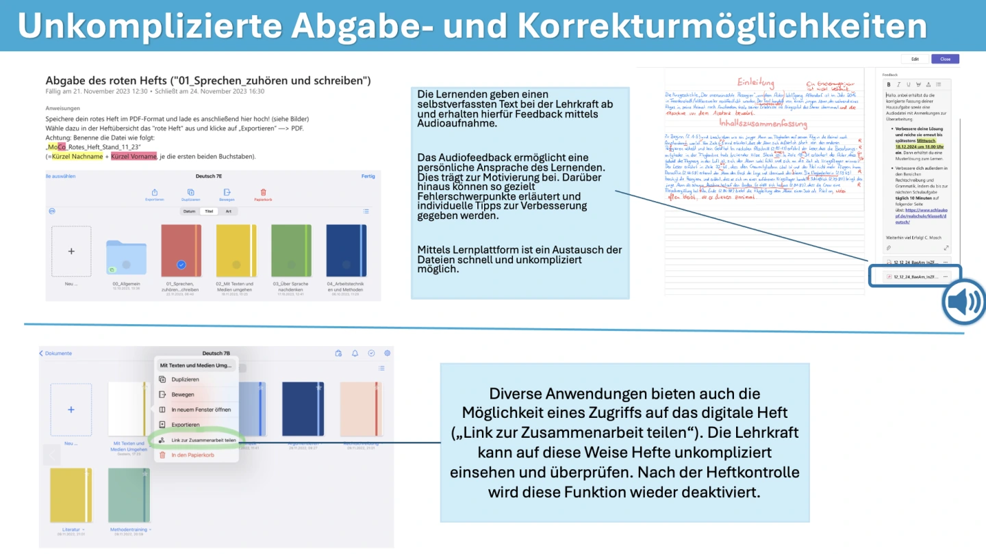“Bei Textproduktionen habe ich jetzt erweiterte Möglichkeiten der Korrektur, z. B. durch digitale Post-its, Fotos der korrigierten Texte, Audiokommentare oder standardisierte Tabellen. Zudem gibt es mit Hilfe des digitalen Hefts nun die Möglichkeit, Feedback zu gesprochenen Texten der Schülerinnen und Schüler zu geben.”