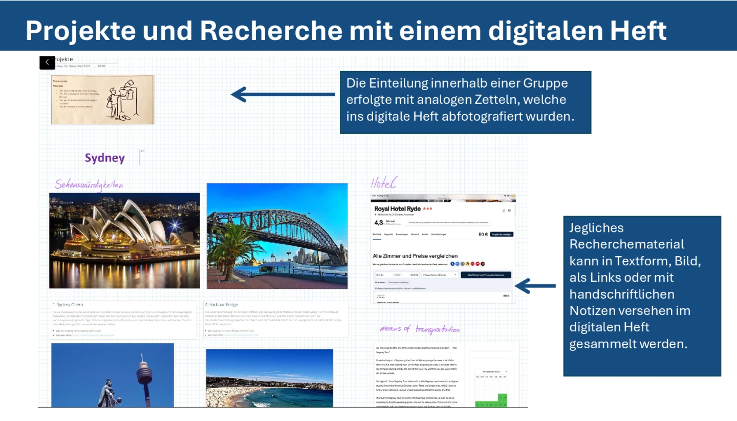 Bei Recherchen oder Projekten können Materialien aller Art im digitalen Heft gesammelt, sortiert und beschriftet werden. Es ist weder ein Drucker noch Schere und Kleber notwendig. Zudem können auch Notizen zu den Recherchen fotografiert und archiviert werden, damit sie nicht in einer Zettelwirtschaft verloren gehen.