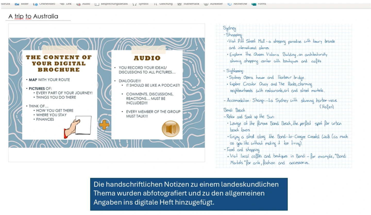 “Gerade im Bereich Landeskunde lasse ich meine Schülerinnen und Schüler oftmals im Internet recherchieren und (Klein)Projekte erstellen. Damit sie bei der großen Menge an Informationen nicht den Überblick verlieren und ‘einen roten Faden’ finden bzw. behalten, sollen sie parallel zur Recherche handschriftlich Notizen anfertigen. Sind diese abgeschlossen, fotografieren die Schülerinnen und Schüler ihre Notizen und übernehmen sie in ihr digitales Heft.”