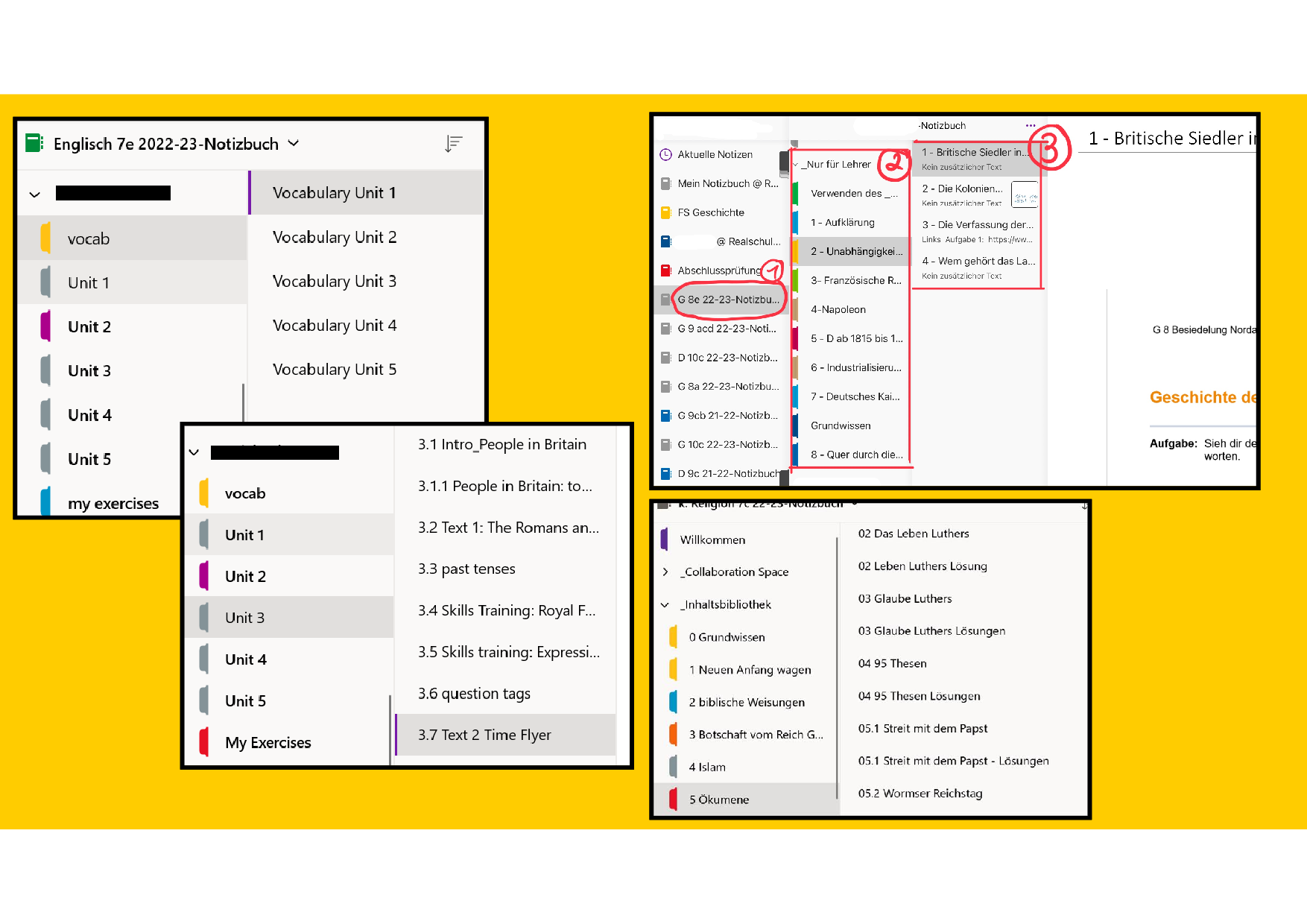 Zusammen mit den Lernenden sollte eine verbindliche Grobstruktur für alle Fächer erstellt werden. Die Schülerinnen und Schüler benötigen eine Gesamtübersicht über alle Fächer und Themen ihrer Jahrgangsstufe. Zudem ist eine Strukturierung auf Fächerebene wichtig, wobei je nach Fach unterschiedliche Unterstrukturen entstehen können. Bei der Entwicklung dieser Vorgaben sollte zudem berücksichtigt werden, ob ein einheitliches oder offenes Konzept verfolgt wird oder ob eine Notizen-App lediglich zur Unterstützung des Unterrichts dient.