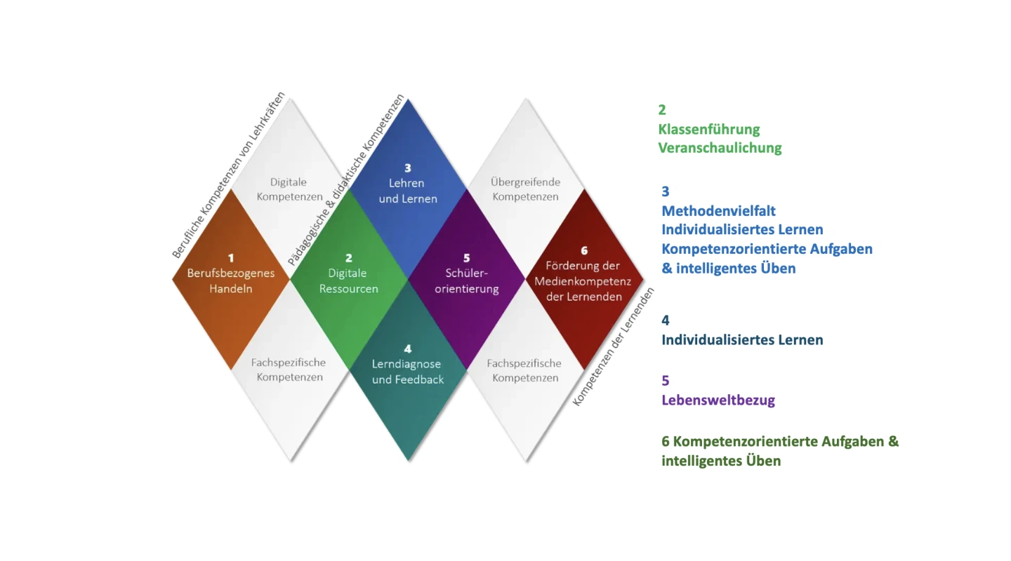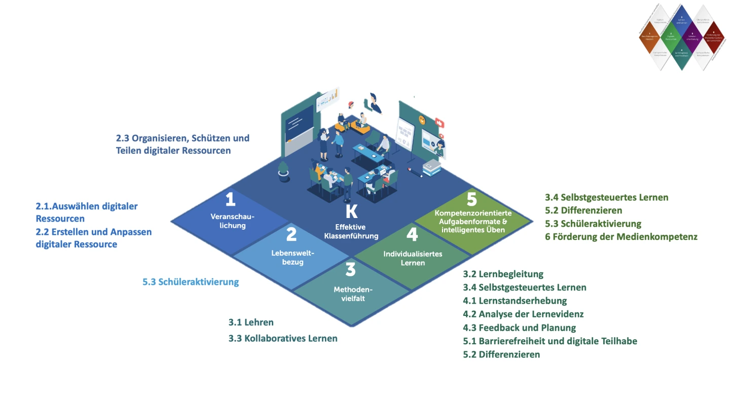 Digitale Medien lernwirksam im Sinne des K+5-Modells einzusetzen, erfordert berufliche, pädagogische und didaktische Kompetenzen. Diese sind im DigCompEduBavaria formuliert und aus den genannten Bereichen abzuleiten.