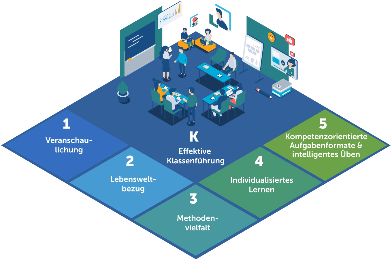 So entstehen die Bereiche: Veranschaulichung, Lebensweltbezug, Methodenvielfalt, individualisiertes Lernen und kompetenzorientierte Aufgabenformate und intelligentes Üben.Klassenführung als zentrale Voraussetzung für einen lernwirksamen Unterricht wird zum Fundament „K“ des Modells.