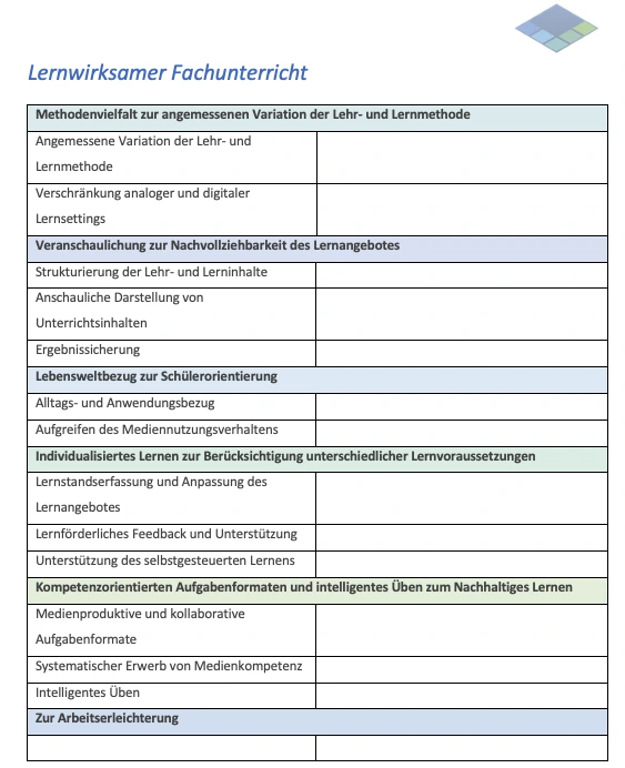 Hinweis zur Nutzung: Es empfiehlt sich, den Bereich „Methodenvielfalt“ zur Verortung fachspezifischer Methoden zu nutzen. Zudem sollte hierbei explizit definiert werden, an welchen Stellen eine Verschränkung von analogen und digitalen Lernsettings für das jeweilige Fach als besonders gewinnbringend erachtet wird.
