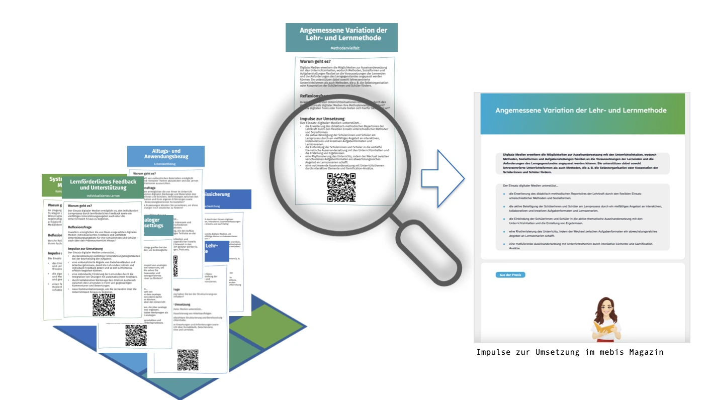 Zunächst sucht jedes Gruppenmitglied individuell nach Beispielen für einen lernwirksamen Unterricht mit digitalen Medien und füllt das entsprechende Feld im K+5 Modells. Als Unterstützung und Denkanstoß finden sich auf den Placemats QR-Codes mit Verlinkungen zu den thematisch passenden mebis Magazin Artikeln.