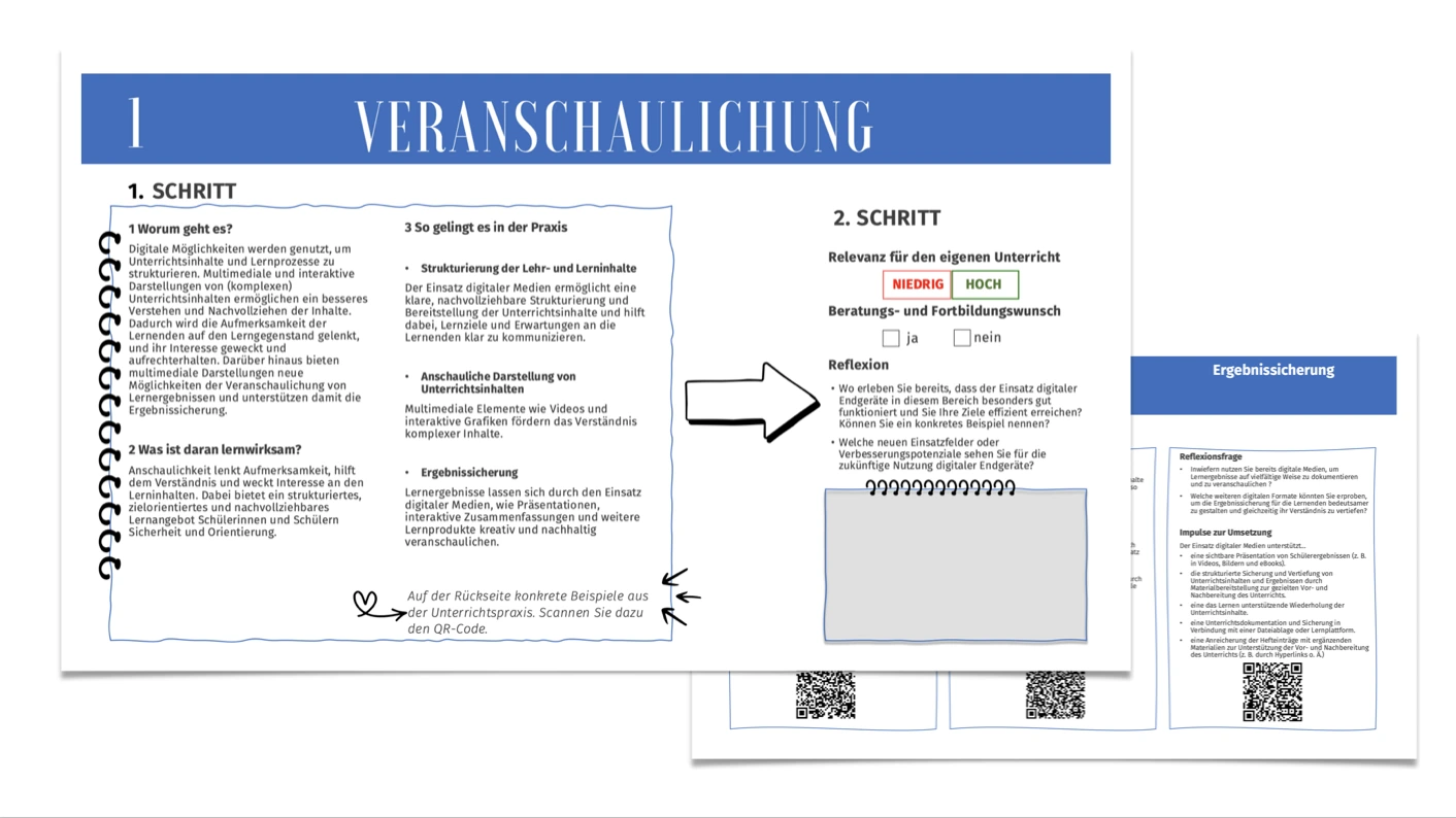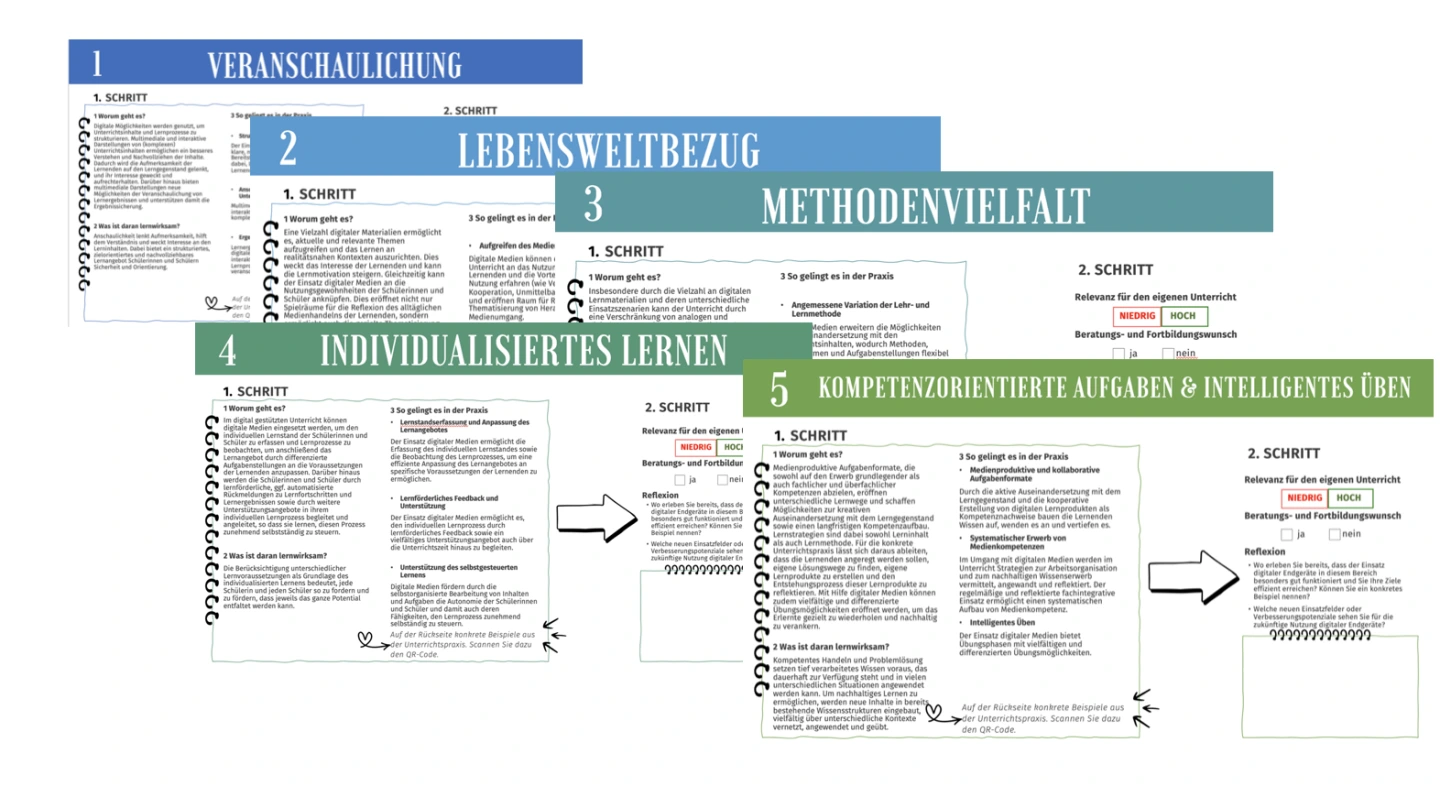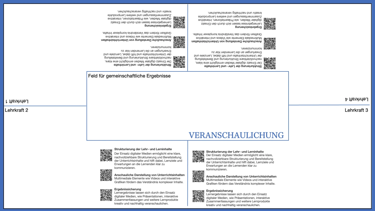 Diese Methoden ermöglichen die systematische und kooperative Erarbeitung des umfassenden Themas („Guter Unterricht in einer digitalen Welt”) durch dessen Aufteilung in fünf spezifische Handlungsfelder oder Aspekte. Ziel ist es, nach einer gemeinsamen Exploration einen oder mehrere Schwerpunkte für die Weiterarbeit zu identifizieren und zu konkretisieren.