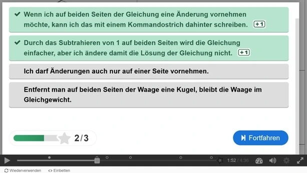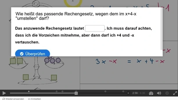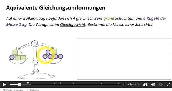 Die Themeneinführung von äquivalenten Gleichungsumformungen ist hier mit Hilfe eines interaktiven Videos umgesetzt. Der Leseanteil ist reduziert und viele Informationen sind auf die Bild- sowie Tonspur ausgelagert.