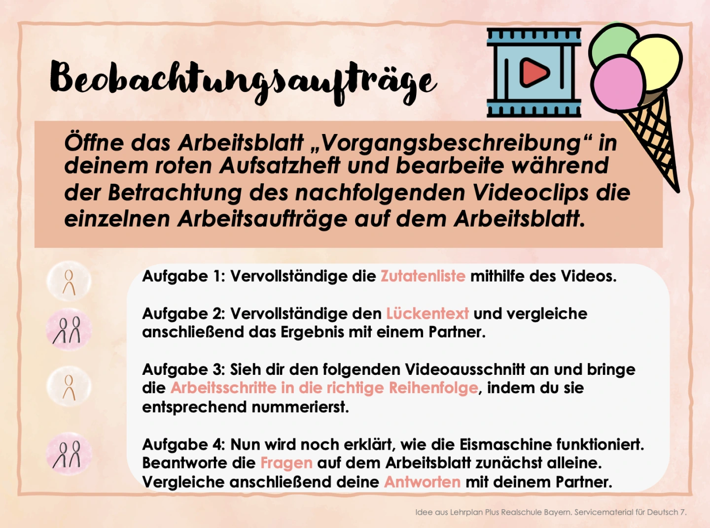 Die Schülerinnen und Schüler erhalten vor dem Ansehen eines Tutorials gezielte Beobachtungsaufträge, die gemeinsam besprochen werden. Während des Films bearbeiten sie diese Aufgaben parallel auf einem Arbeitsblatt, wodurch ihr Blick auf das Wesentliche gelenkt wird. Durch wiederholte Anwendung dieser Methode verbessern sie ihre Fähigkeit, zentrale Inhalte eines Films zu erfassen.