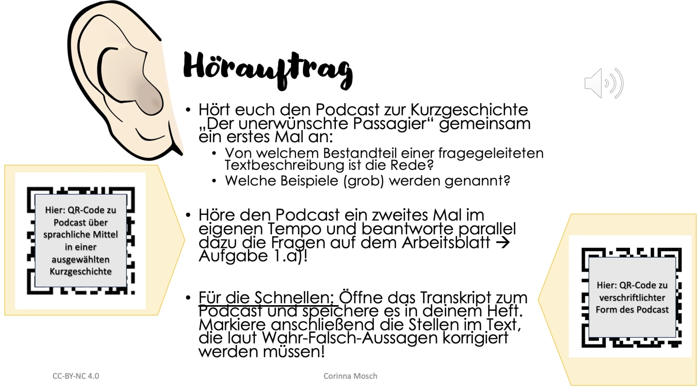 Die Lernenden setzten sich durch gezielte Höraufträge aktiv und konzentriert mit einem Podcast auseinander, wobei sie parallel zum Anhören Aufgaben auf einem Arbeitsblatt bearbeiten. Schnelle Lernende vertiefen ihre Analyse, indem sie das Gehörte als Transkript erhalten und darauf passende Textstellen markieren.