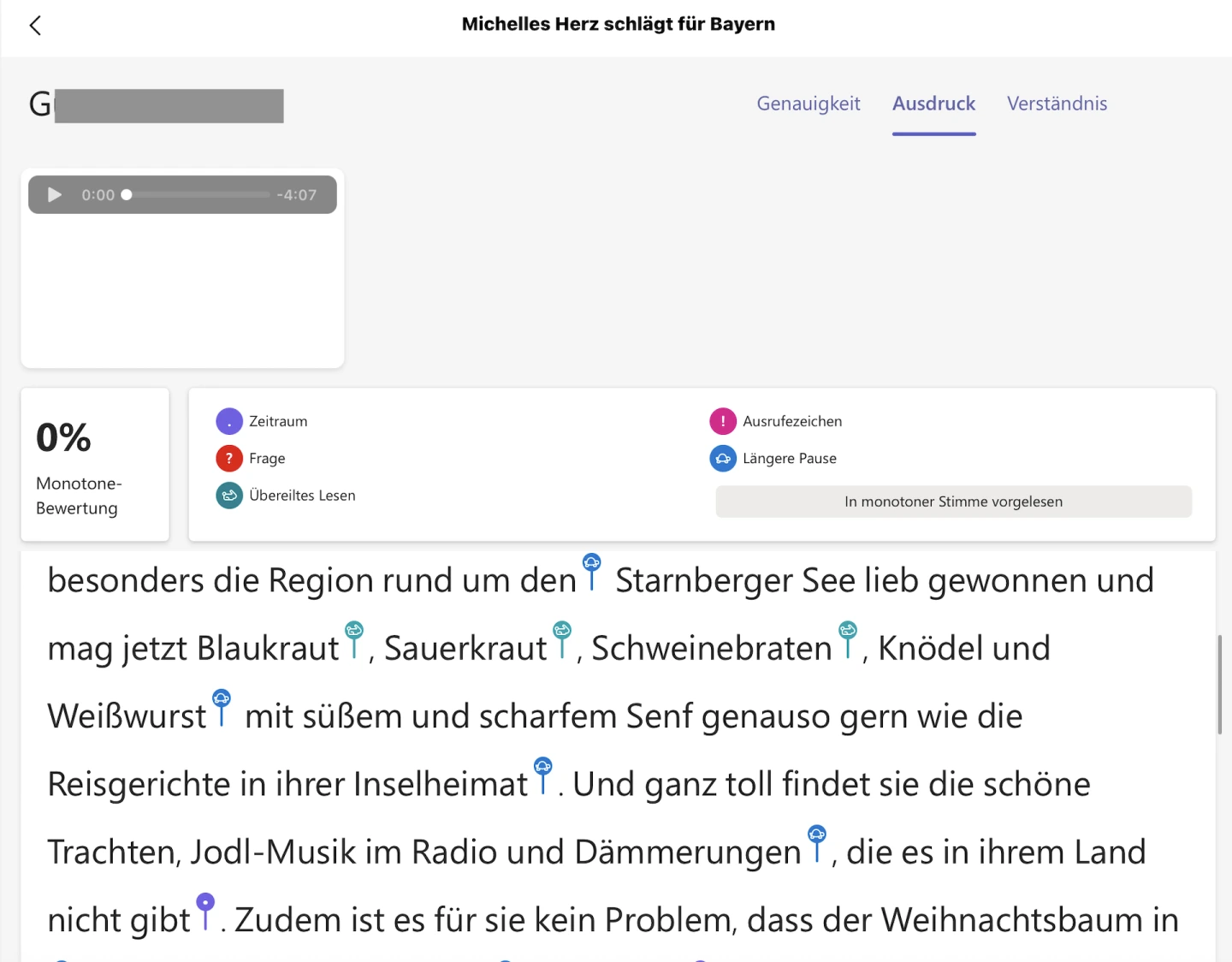 Im Rahmen einer digitalen Leseaufgabe erhält der Lernende unmittelbar im Anschluss an das laute Vorlesen Rückmeldung zu seinen Lesefähigkeiten. Darüber hinaus können Fragen zur Überprüfung des inhaltlichen Verständnisses mit automatisierter Auswertung der Antworten erfolgen.