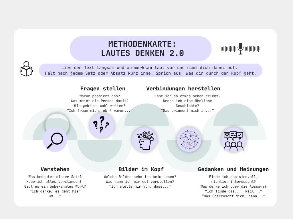 Nachdem die Lernenden dieses laute Denken einmal erlebt haben, können sie es bei einem weiteren Textabschnitt selbst ausprobieren: Sie lesen nicht nur still, sondern kommentieren den Text Satz für Satz – z. B. mithilfe einer Methodenkarte, die ihnen geeignete Fragen und Impulse liefert.
