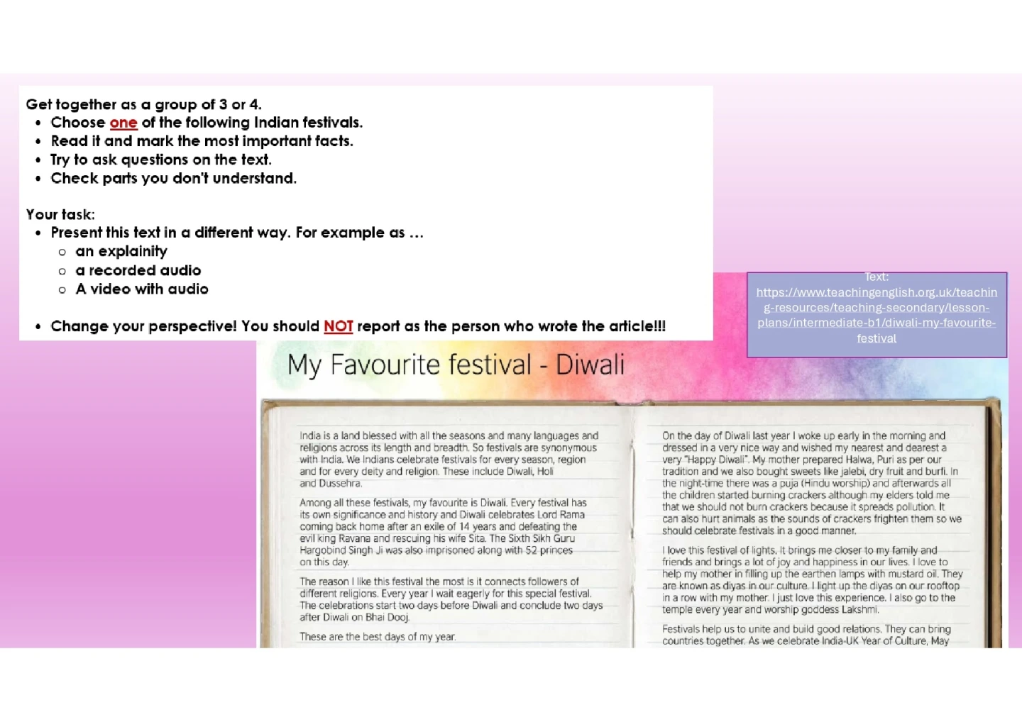 Mithilfe digitaler Tools (markieren, unterstreichen, Textteile ausschneiden...) erarbeiten die Lernenden zunächst den Inhalt eines rein linearen Textes. Anschließend nehmen sie einen Perspektivwechsel ein und stellen kollaborativ-kooperativ den Inhalt des Textes in kreativer, digitaler Form dar.