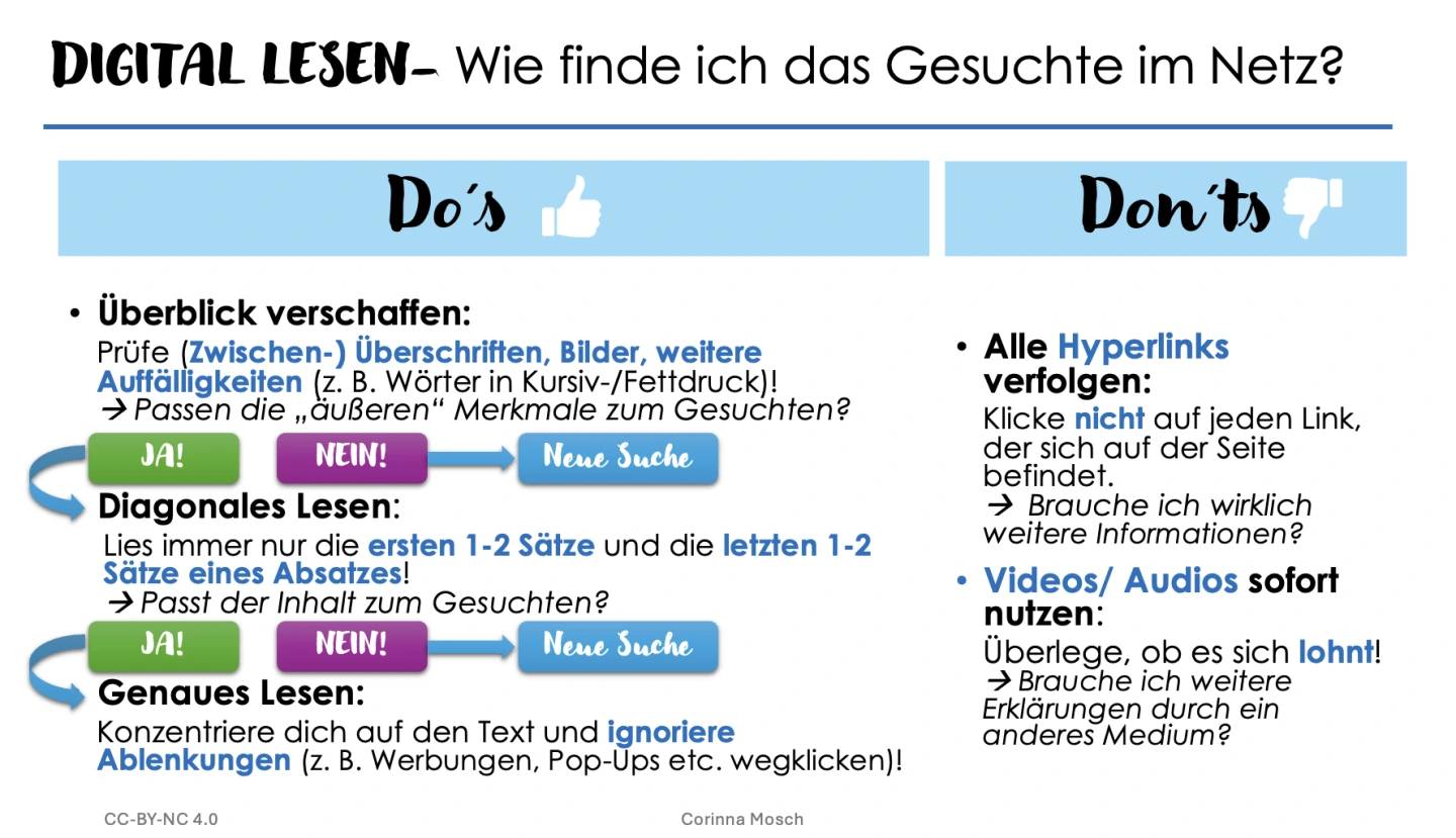 Die riesige Menge digitaler Texte im Internet macht es schwer, relevante Informationen zu finden und sich nicht darin zu verlieren. Ein klares Lese- oder Rechercheziel, das durch problemorientierte Aufgaben entwickelt wird, hilft Schülerinnen und Schülern dabei, den Fokus zu behalten. Die Auswahl passender Suchbegriffe und die Bewertung der Seriosität von Quellen sind weitere zentrale Kompetenzen. Unterstützend wirken dabei Methoden wie Mindmaps, der Einsatz von Kindersuchmaschinen oder vorbereitete digitale Lernumgebungen. Zusätzlich fördern technische Kenntnisse und gezieltes Feedback die Lesekompetenz im digitalen Raum.
