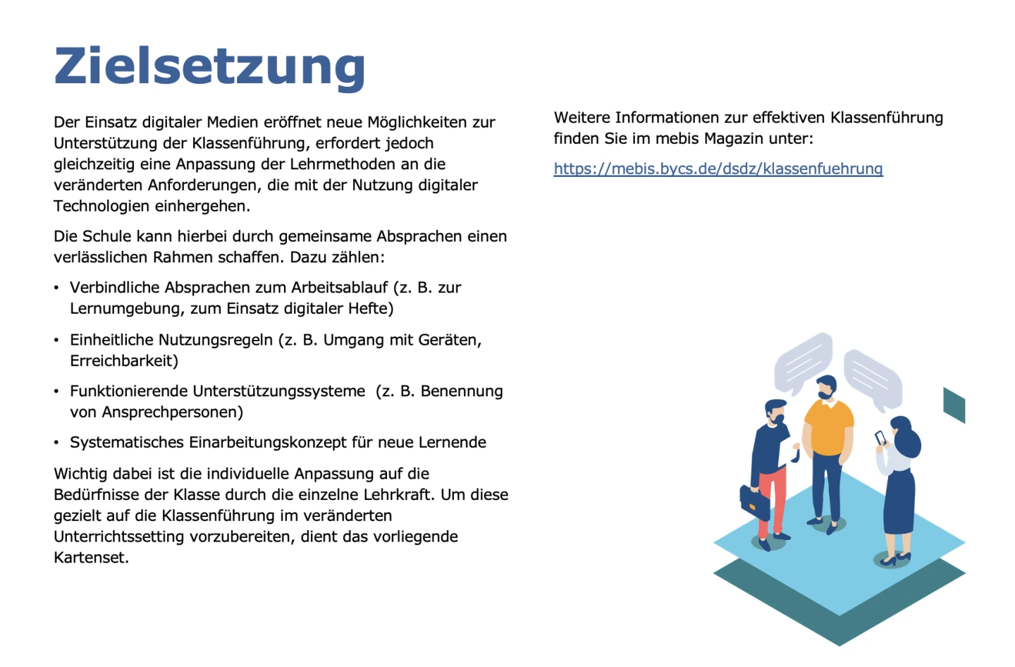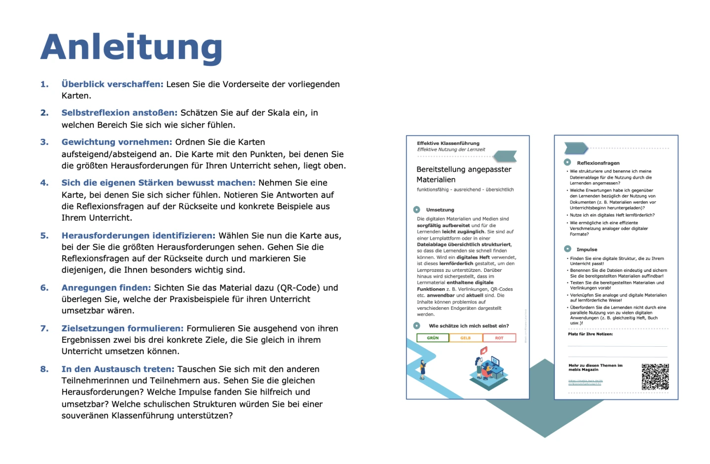 Das vorliegende Kartenset Klassenführung kann zur Grundlage eines Workshops mit Kollegien gemacht werden. Zuvor empfiehlt es sich grundlegende pädagogische Rahmenbedingungen (Regeln, Abbilden des Workflows, etc.) mit den Ansprechpersonen zu klären.