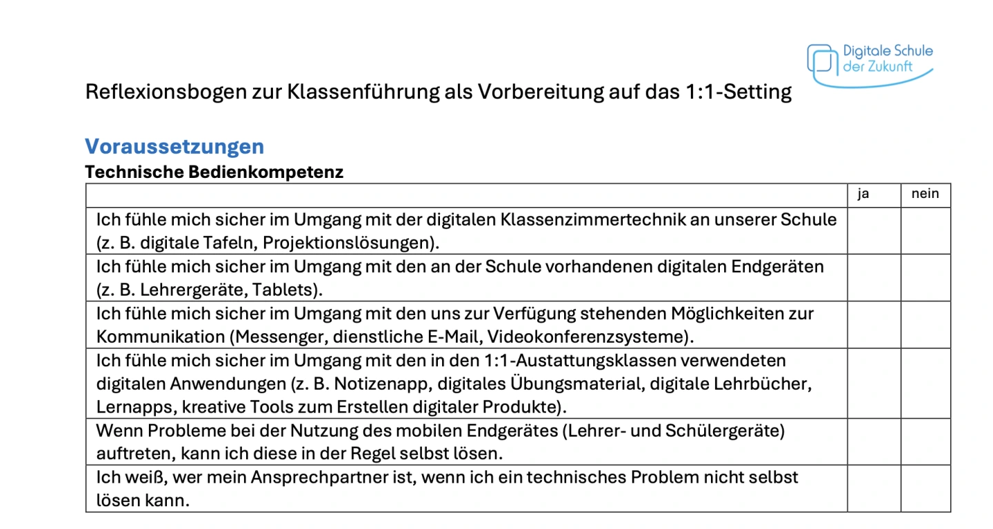 Diese schulinternen Vereinbarungen und verlässlichen Rahmenbedingungen schaffen Sicherheit für alle Beteiligten. Sie eröffnen den Lehrkräften pädagogisch-didaktische Handlungsspielräume zur Entwicklung eigener Unterrichtsmethoden und bieten eine verlässliche Grundlage für einen möglichst störungsfreien Unterricht und eine effiziente Nutzung der Lernzeit. Hier finden Sie eine Präsentationsvorlage, die das Bewusstsein für die Notwendigkeit dieser Rahmenbedingungen schärft. Die Zielgruppe sind dabei Projektverantwortliche für die Implementierung und Weiterentwicklung einer 1:1-Ausstattung.