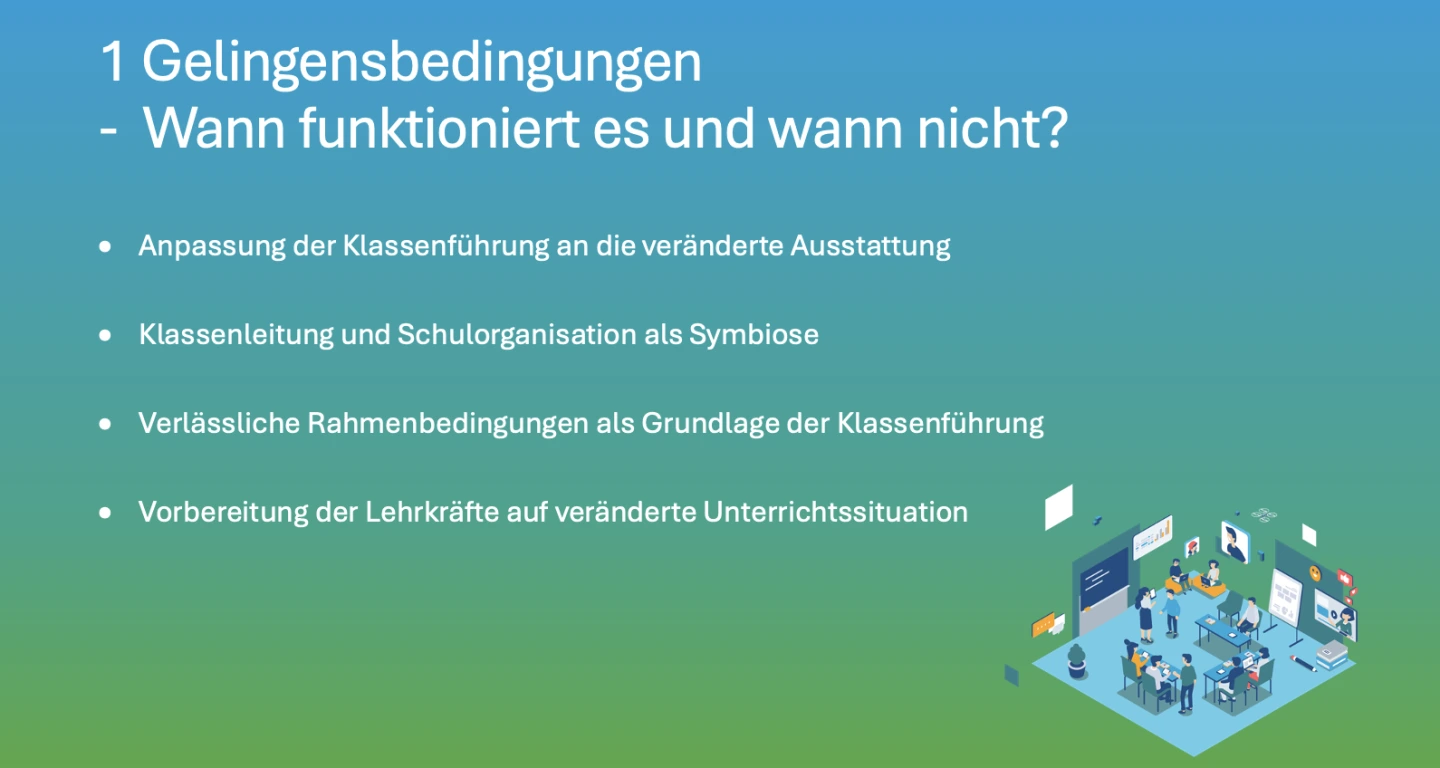 Die Anpassung der Klassenführung erfordert gemeinsame Absprachen, verlässliche pädagogische Rahmenbedingungen seitens der Schule und eine gezielte Vorbereitung der Lehrkräfte auf das veränderte Unterrichtssetting. Zu den wichtigsten Voraussetzungen gehören: