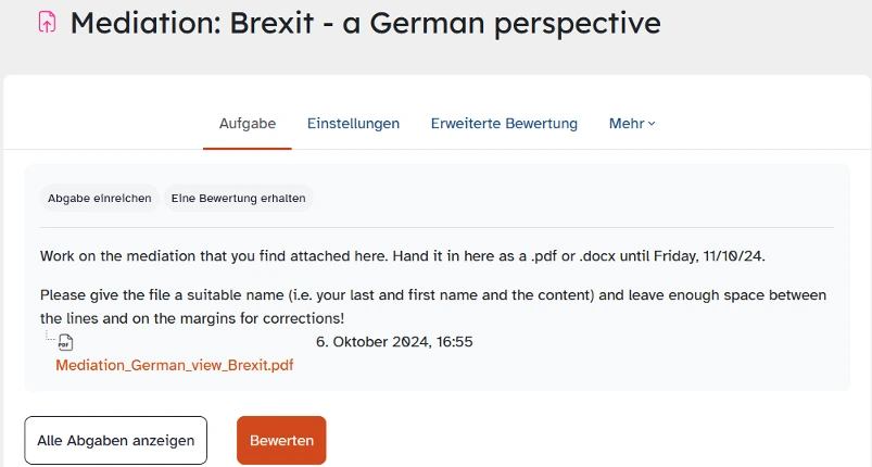 So wie ich vorher analoge Hefte gelegentlich eingesammelt und durchgesehen habe bzw. Hausaufgaben korrigiert habe, lasse ich diese Heftseiten bzw. Dokumente jetzt in mebis mit der Funktion „Aufgabe“ hochladen. Ich kann wählen, ob ich direkt in die Texte hinein korrigieren will, ob ich sie herunterlade, korrigiere und wieder mit einem Kommentar und gegebenenfalls einer Bewertung versehen hochlade, oder ob ich einen Audiokommentar gebe. Wichtig ist, die Schülerinnen und Schüler dazu anzuhalten, die Dateien sinnvoll zu benennen, so dass ich als Lehrkraft die Dateien gleich entsprechend zuordnen kann und kein zusätzlicher Aufwand entsteht. Ich persönlich öffne die Texte in den jeweiligen Programmen, speichere die Korrekturen und lade die Dokumente dann zusammen mit einem Kommentar wieder in mebis hoch. Wenn die Schüler eine E-Mail-Adresse hinterlegt haben, bekommen sie auch eine entsprechende Nachricht, dass sie eine Korrektur erhalten haben.