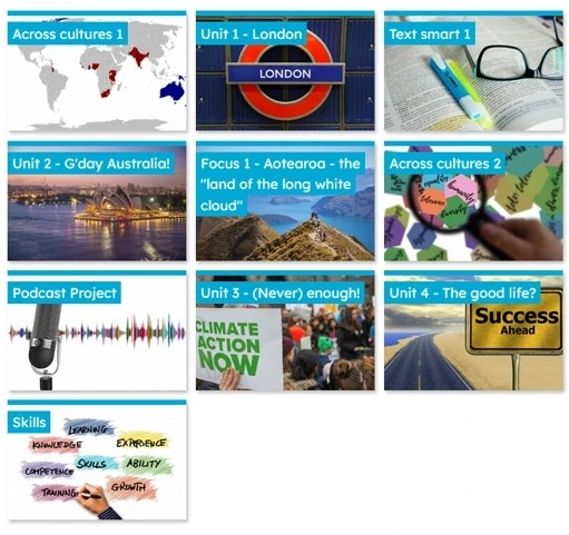 Für meinen Kurs habe ich das Kachelformat gewählt. Jede Kachel entspricht einer Lektion aus dem Buch, so dass für die Schülerinnen und Schüler gut nachvollziehbar ist, in welchem Bereich wir aktuell arbeiten. -