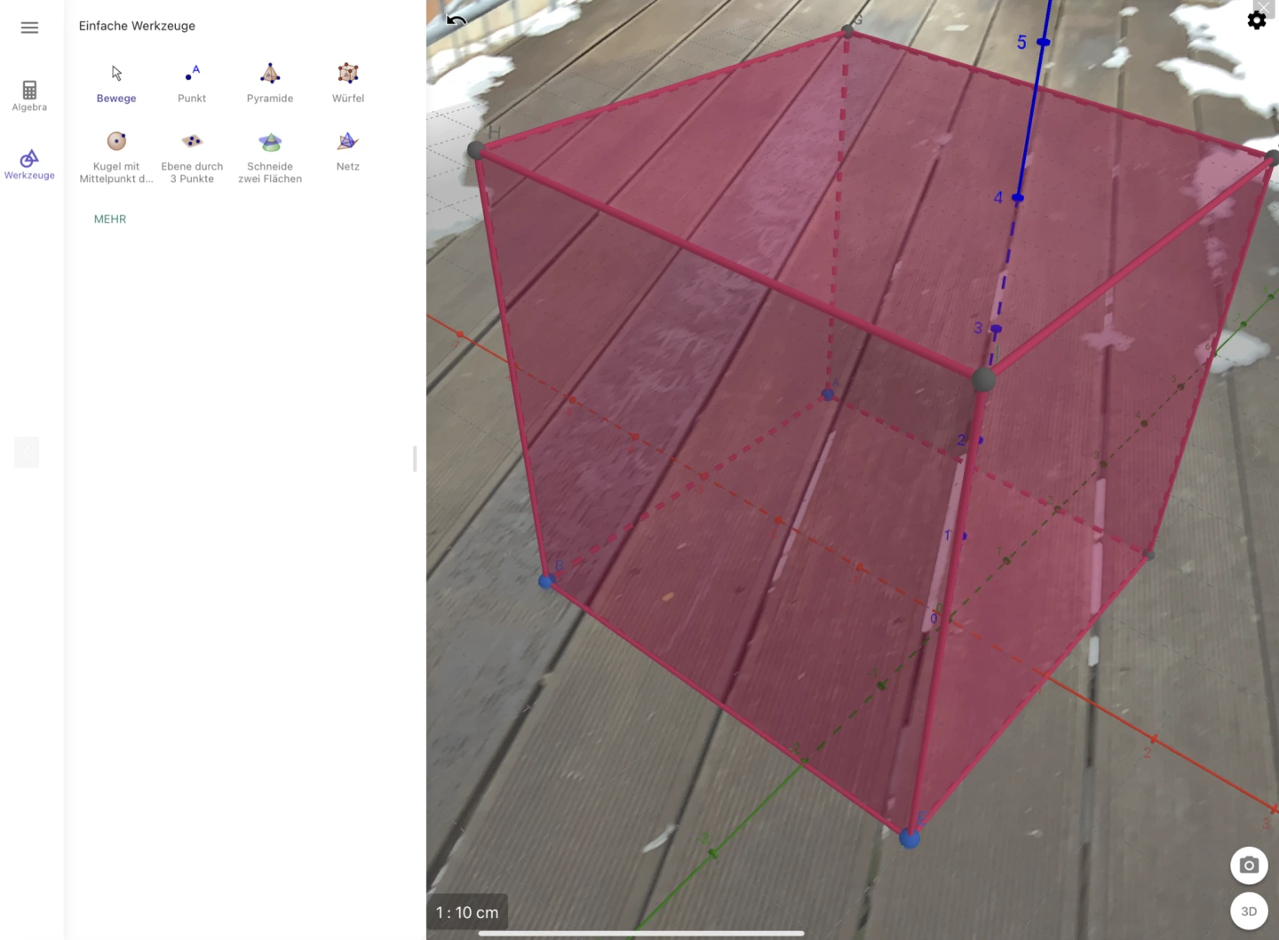 Augmented-Reality-Apps greifen auf die Kamerafunktion zu, um Daten anzuzeigen oder virtuelle Objekte im Raum erscheinen zu lassen. So können dreidimensionale Gegenstände im Raum simuliert werden, die von Schülerinnen und Schülern von allen Seiten betrachtet und teilweise sogar verändert werden können.