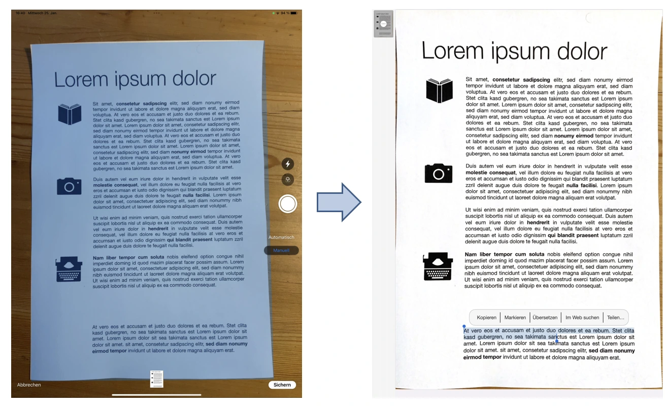 Dokumente in Papierform können unkompliziert gescannt und digitalisiert werden. Eine Schrifterkennung (Optical Character Recognition, sog. OCR) ermöglicht es, den Text zu durchsuchen, zu kopieren und damit weiterzuarbeiten.