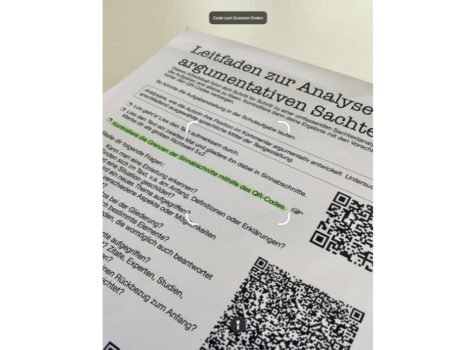 Mit der Kamera können QR-Codes gescannt werden. Diese führen z. B. zu Webseiten oder zu online bereitgestellten Dateien. QR-Codes können auch reinen Text beinhalten, der mit bloßem Auge nicht lesbar ist. So können versteckt Lösungen oder Hilfestellungen für Aufgaben bereitgestellt werden.