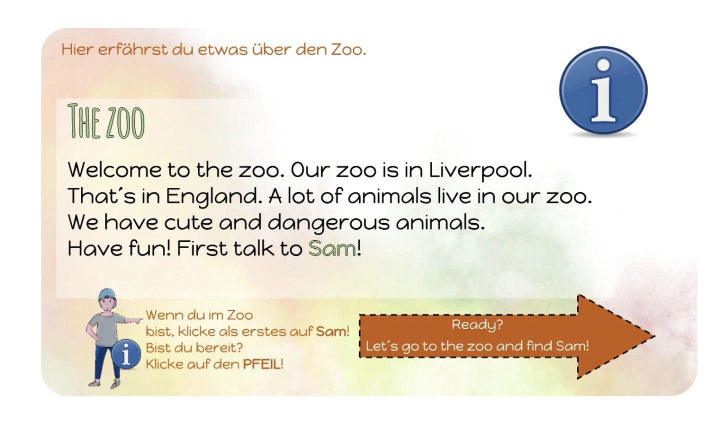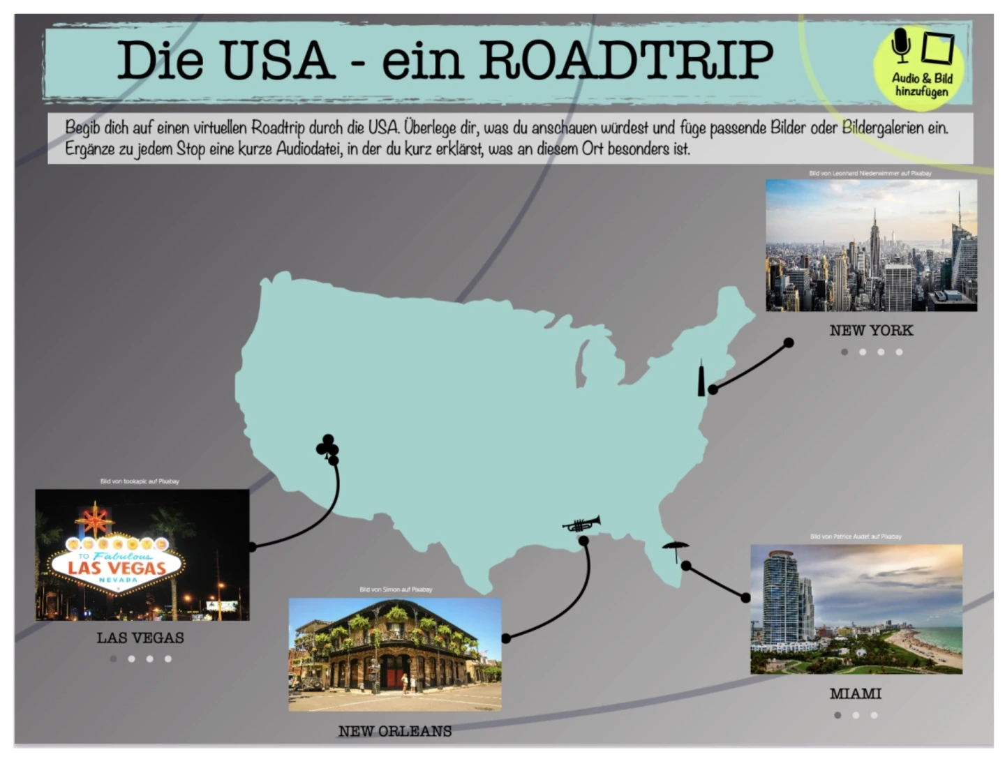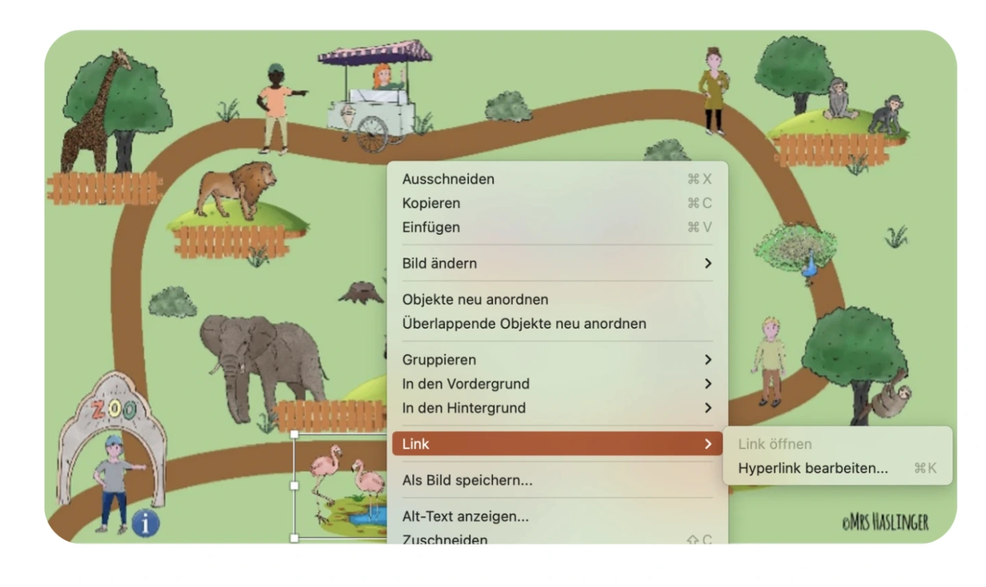 Das lineare Format (hier: Ausgangsfolie mit Bild) ermöglicht die Vorgabe einer klaren Reihenfolge der zu bearbeitenden Aufgaben oder anzuwendenden Methoden. Mittels Hyperlinks gelangen die Lernenden im vorliegenden Beispiel durch das Anklicken einzelner Stationen zu einem integrierten Textabschnitt. Nach jedem Lesen werden sie wieder zum Wimmelbild zurückgeführt.