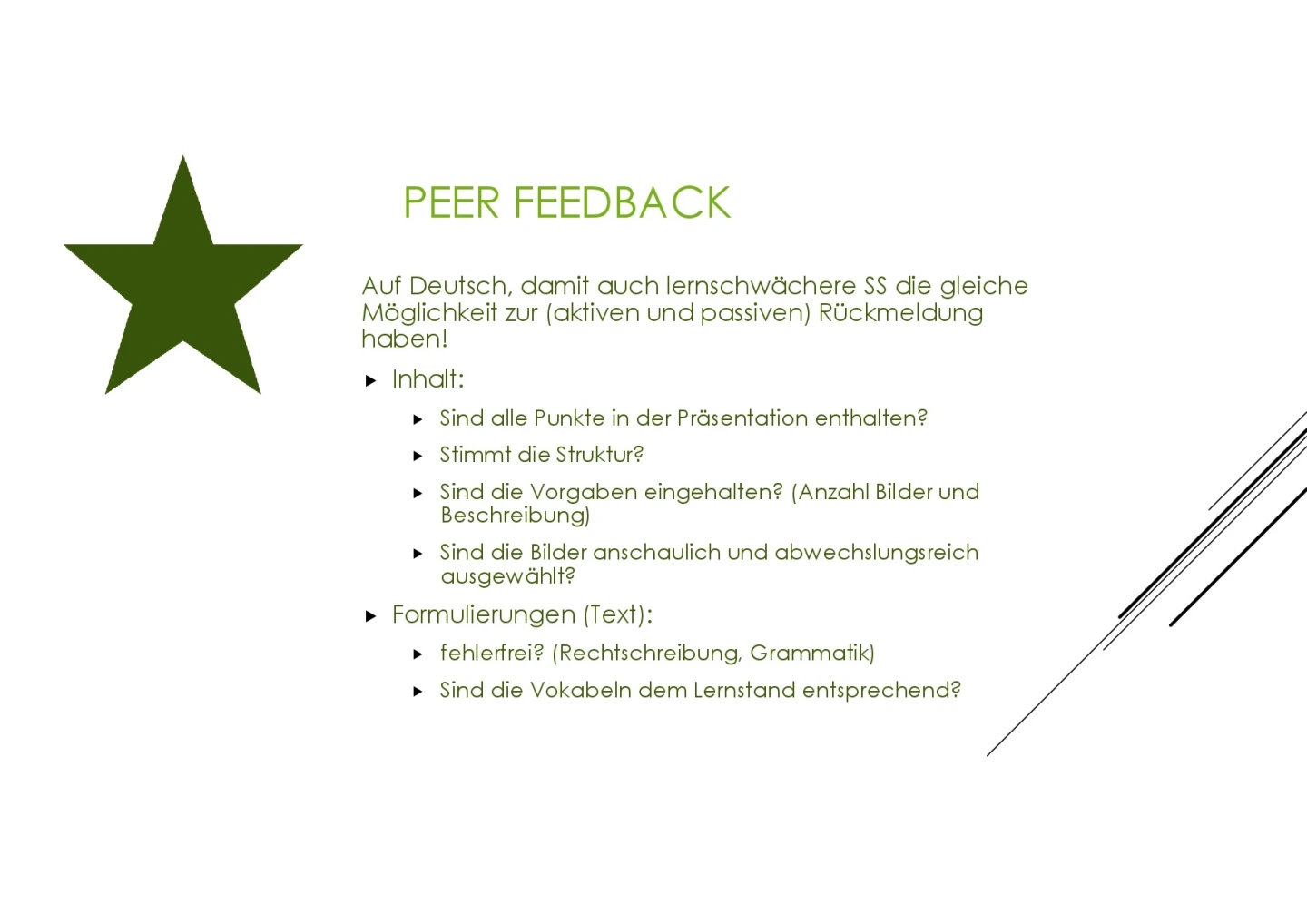 Die Schülerinnen und Schüler erhalten kriteriengeleitetes Feedback auf den Inhalt.