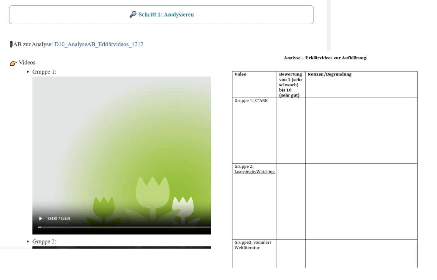 Vergleich verschiedener Erklärvideos zum Thema „Aufklärung“: Arbeitsteilige Gruppenarbeit (4er Gruppen, je nach Klassengröße arbeiten zwei Gruppen mit dem gleichen Video). Sichtung und Analyse der von Lehrkraft zur Verfügung gestellte Lernvideos (Kopfhörer)