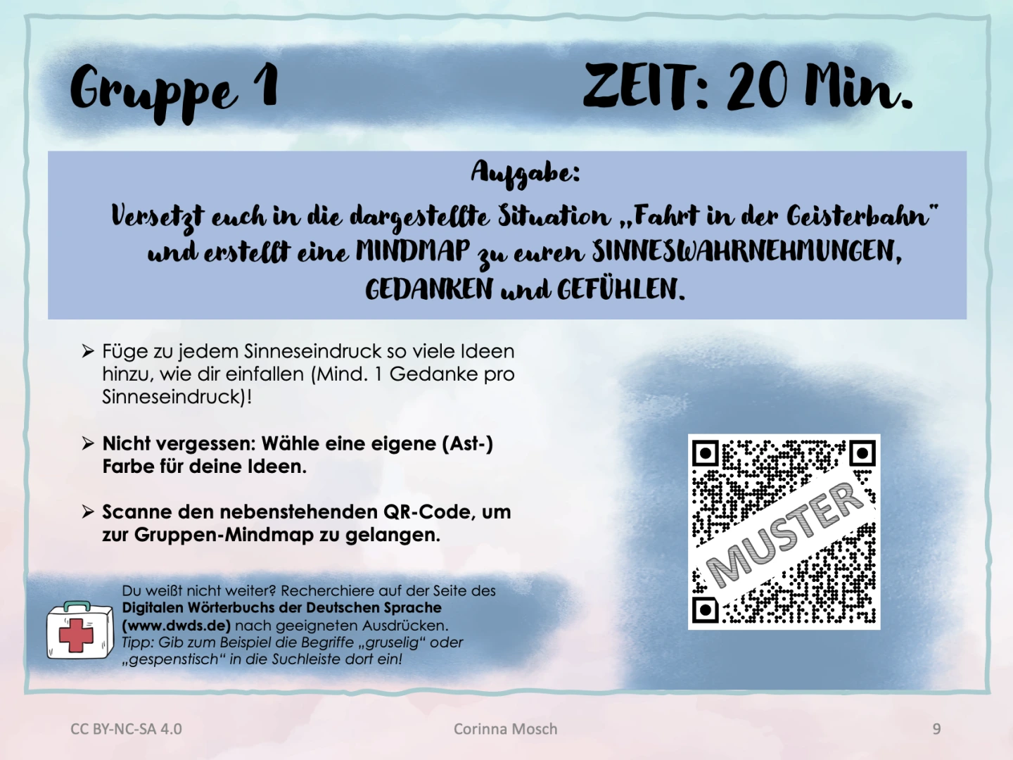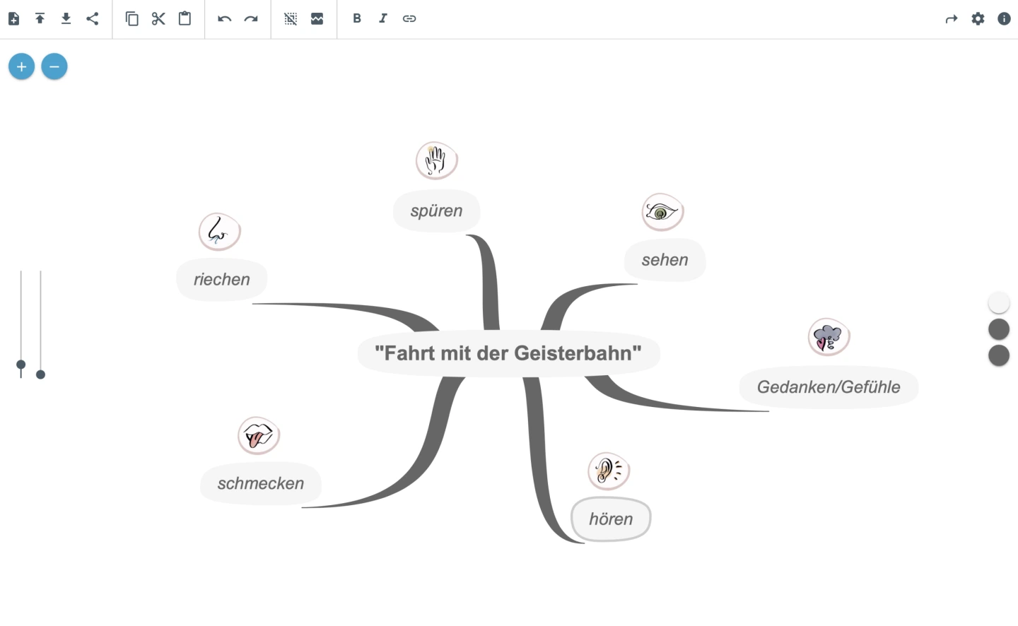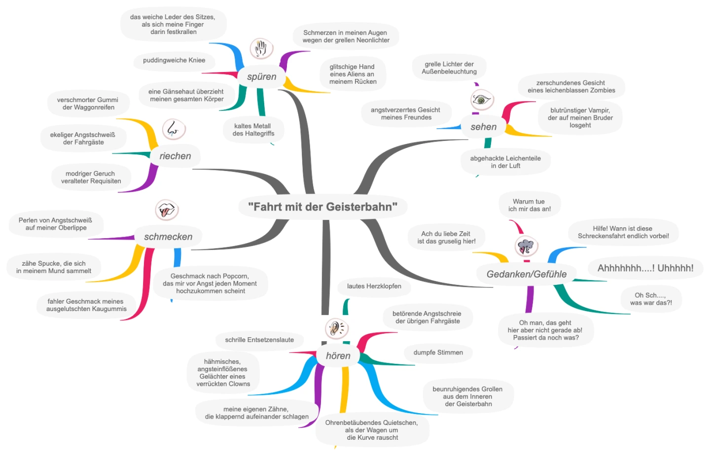 Schülerergebnis_Gruppenarbeit zur Sammlung von Sinneseindrücken zu einer vorgegebenen Situation Die Lernenden arbeiten kooperativ oder in Einzelarbeit an digitalen grafischen Strukturierungsformen. Diese unterstützen in Form von Mindmaps, Concept Maps, Zeitleisten oder Tabellen das Verständnis.