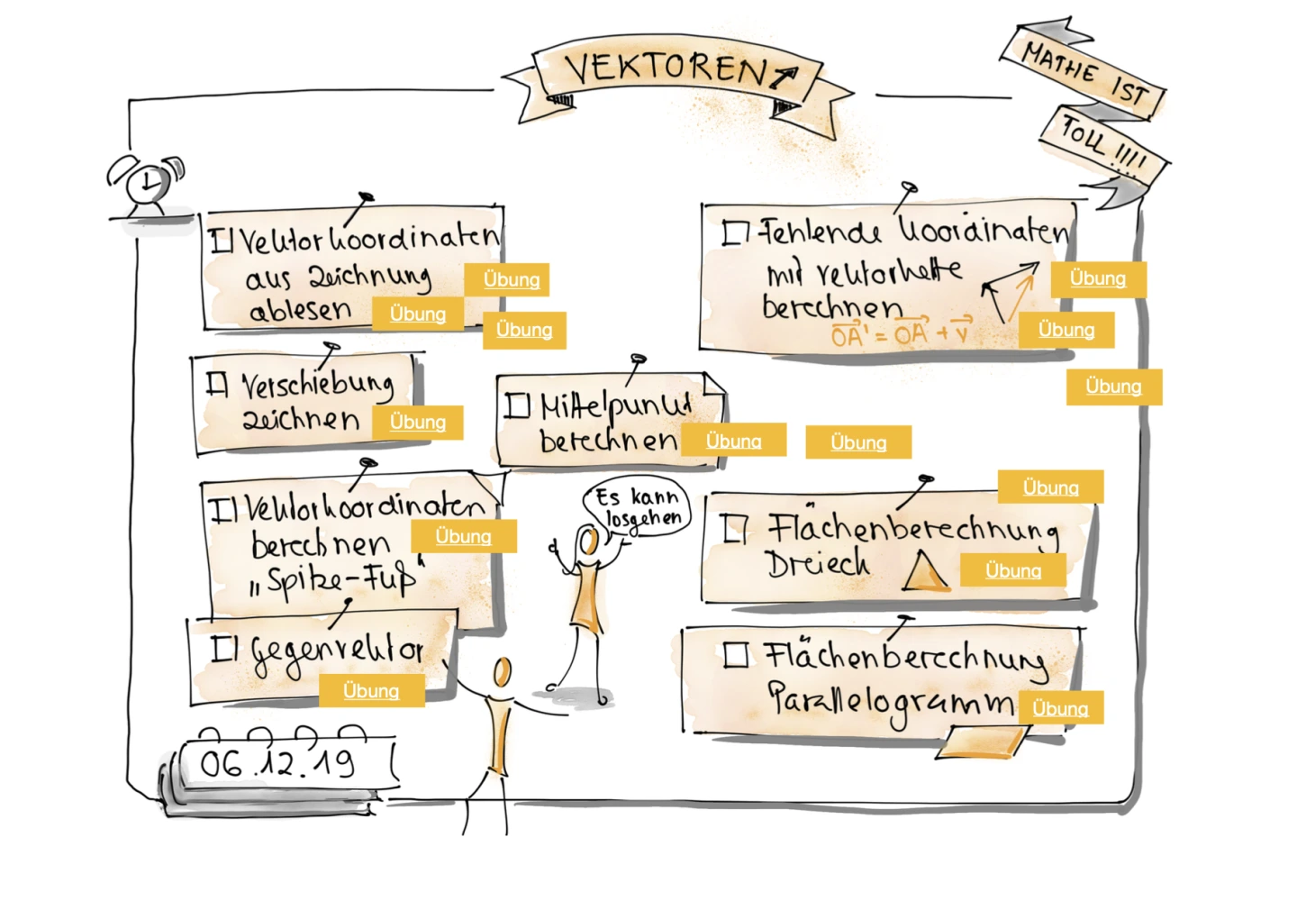 Bei Sketchnotes handelt es sich um visuelle Notizen, die aus Texten, Zeichnungen, Symbole und Diagramme entstehen, um Zusammenhänge darzustellen. Sie folgen einer freien Struktur und weisen weniger formalisierte Verbindungen auf. Der Fokus liegt hierbei auf visueller Anziehungskraft.