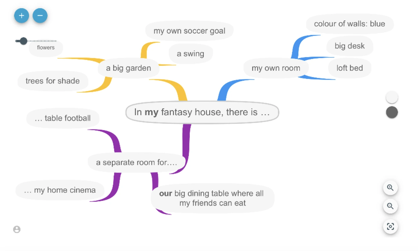 Im Unterschied zur analogen Variante können im Digitalen beliebig viele oder auch nachträglich Ideen ergänzt werden, ohne dass die Übersichtlichkeit darunter leiden muss. Auf einfache Weise lassen sich Anpassungen und Änderungen der Struktur vornehmen, indem einzelne Knoten und Äste ohne großen Aufwand verschoben werden.