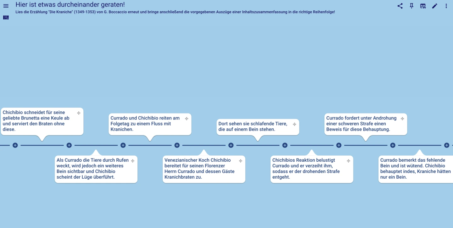 Texte können durch geeignete Tools visualisiert und in eine nachvollziehbare (zeitliche) Struktur gebracht werden. Das digitale Format steht dauerhaft sowohl als Überblicksdarstellung als auch zur Aktivierung von Vorwissen, aber auch zur Grundlage für Folgestunden zur Verfügung.